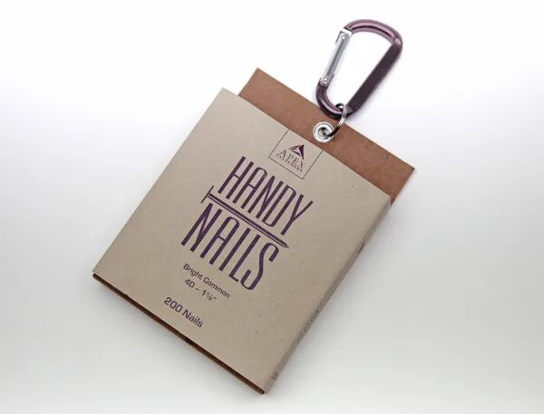 梅丽莎·阿彻(Melissa Archer)为钉子设计的包装,整体为抽拉式,钉子固定在瓦楞纸板内托上,内托上巧妙的增添了登山扣配件,用来挂在工匠的皮带环上。解决了工匠单手作业、登高作业等情况下,难以取用钉子的问题。工人方便快捷的接触到钉子,同时避免被刺伤。虽然量产成本较大,但在包装功能多样化、“包装人机工程方向优化”等方面,有较好的借鉴意义。