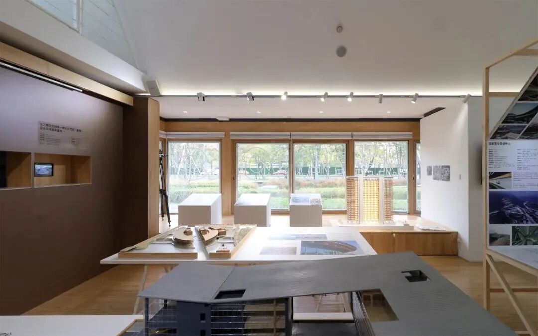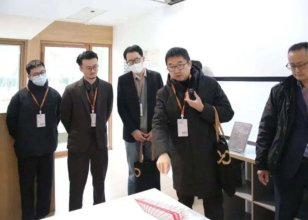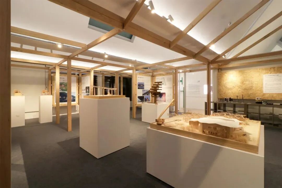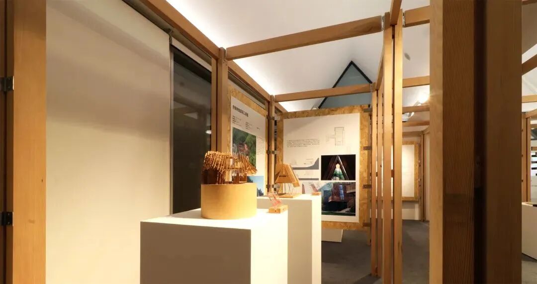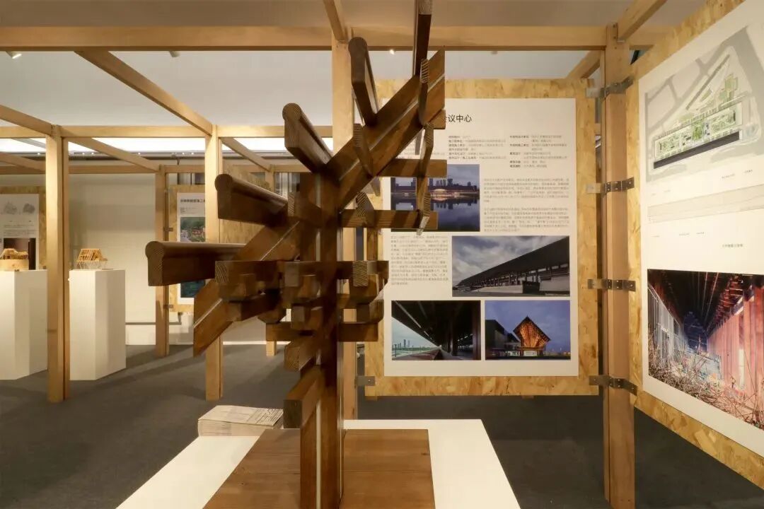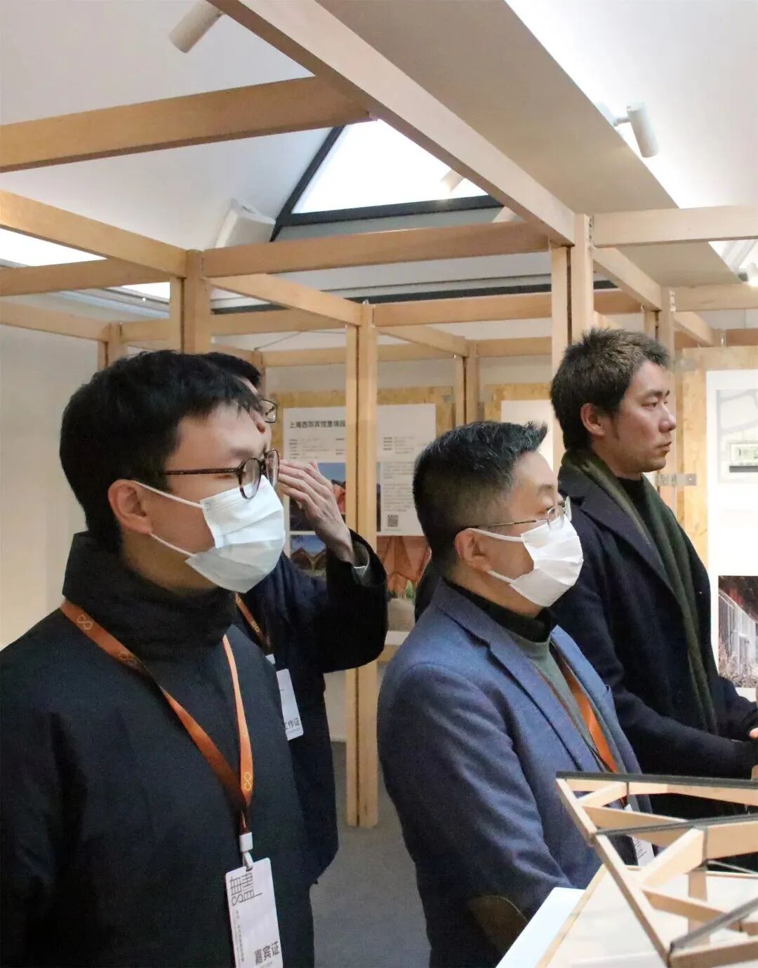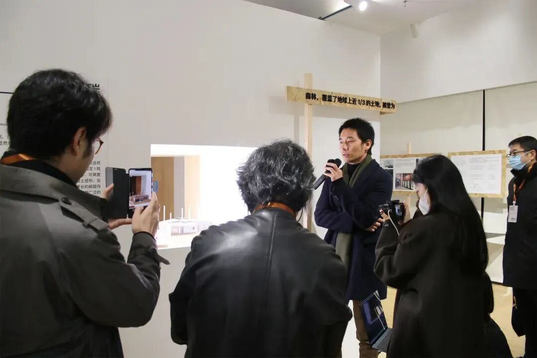 在开幕式嘉宾致辞结束后,由工作人员引导各位嘉宾沿“无界:超越材料的建构和美”“无碳:走向未来的木构建筑”“无限:当代木结构建筑掠影”的展览动线参观,并由各位嘉宾分别介绍各自代表方的参展项目。此次展览由当代木结构建筑实践着眼,展出十余个不同类型的现代木结构建筑项目。
