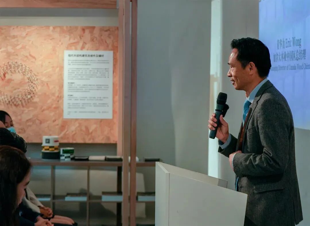 加拿大驻上海总领事馆副总领事兼商务专员赵诚敏先生代表加拿大领事馆受邀进行开场致辞,他介绍了加拿大丰富的可持续森林资源和中国作为加拿大第二大林产业出口国的市场重要性。同时,他强调,在可持续森林和新一代木产品的战略加持下,使得2020年的加拿大国家建筑规范中采用木结构建造高达十二层的建筑物成为了可能。他希望这场展览和系列活动,能够为中国建筑领域的专家和建筑师们提供一个在这个新的(强调生物多样性、可持续社区和双碳目标的)时代下的有意义的平台,探索加拿大木材应用的更多可能性。