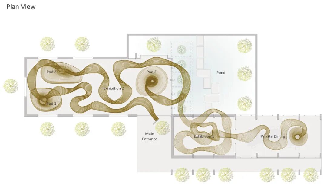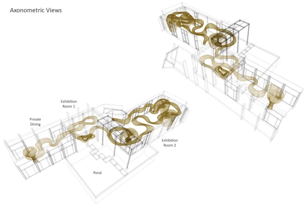 这一概念集中于流动空间、参数化技术和动态形式的当代设计思想,而这些设计思想不能从单一的角度进行观察。设计师们通过使用专业软件模拟云和蒸汽的运动轨迹,藤条结构在画廊的各个区域中无缝编织,最终形成一系列空间结构,作为即将展出的系列的枢纽。