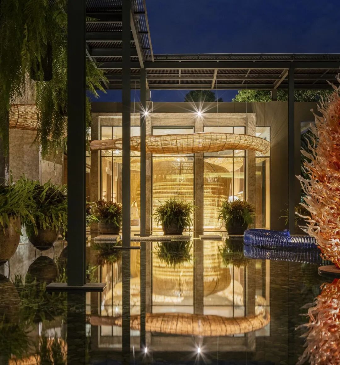 藤条的建造工程在疫情隔离期间开始,该结构分别跨越了5m、4m和3.5m高的三个主体空间。每一批材料都从工厂运到清迈的现场,并在现场进行组装。照明结构是藤条安装的最后一个装置,灯具和谐地漂浮在画廊不同区域的上方,连接了庭院和餐厅,并贯穿到展示区,将画廊的内部和外部相结合。