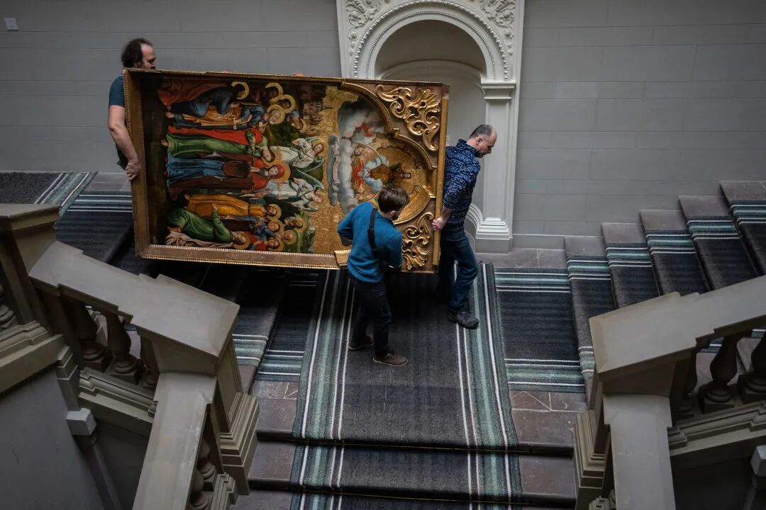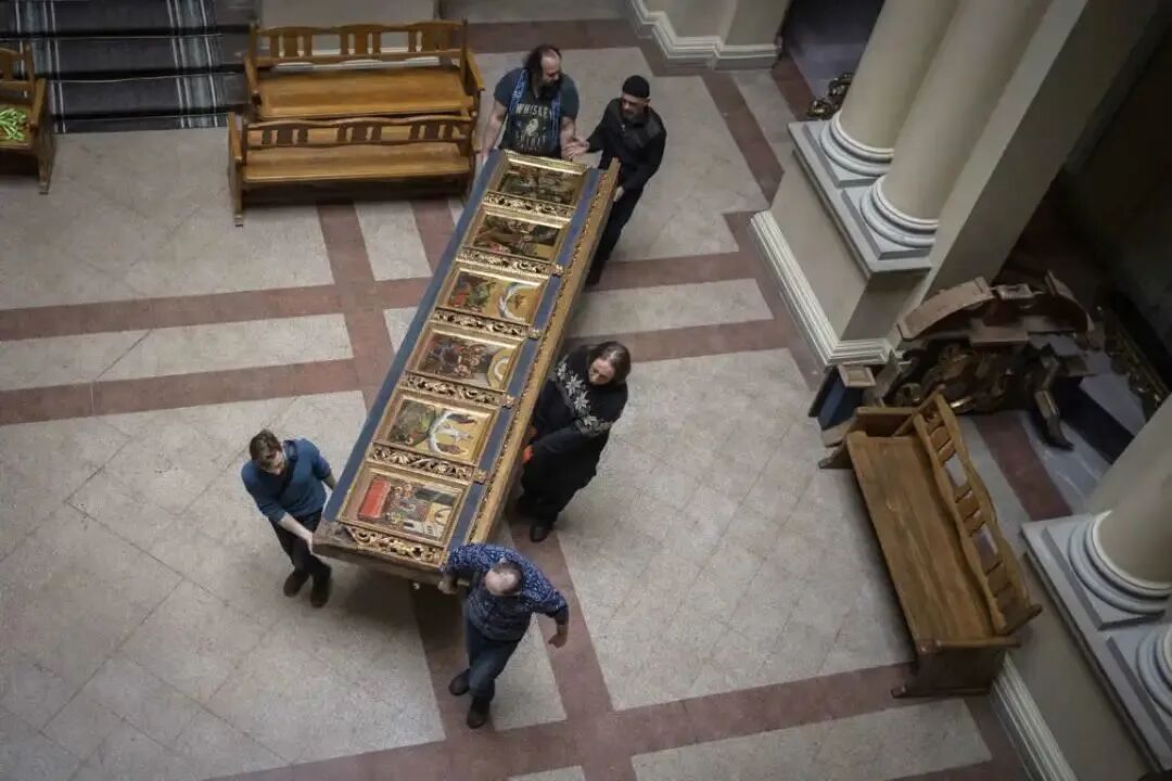 / 面料战火入侵,国立利沃夫博物馆的工作人员开始紧急转移馆内的艺术作品,将其储存至更为安全的地方 / 图源:Bernat Armangue / AP Photo