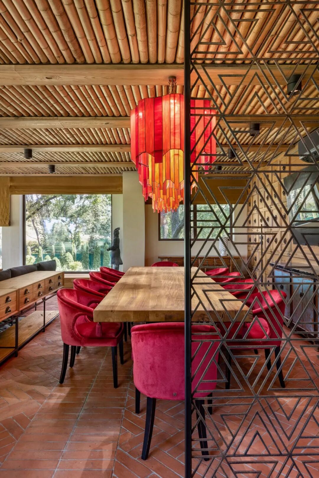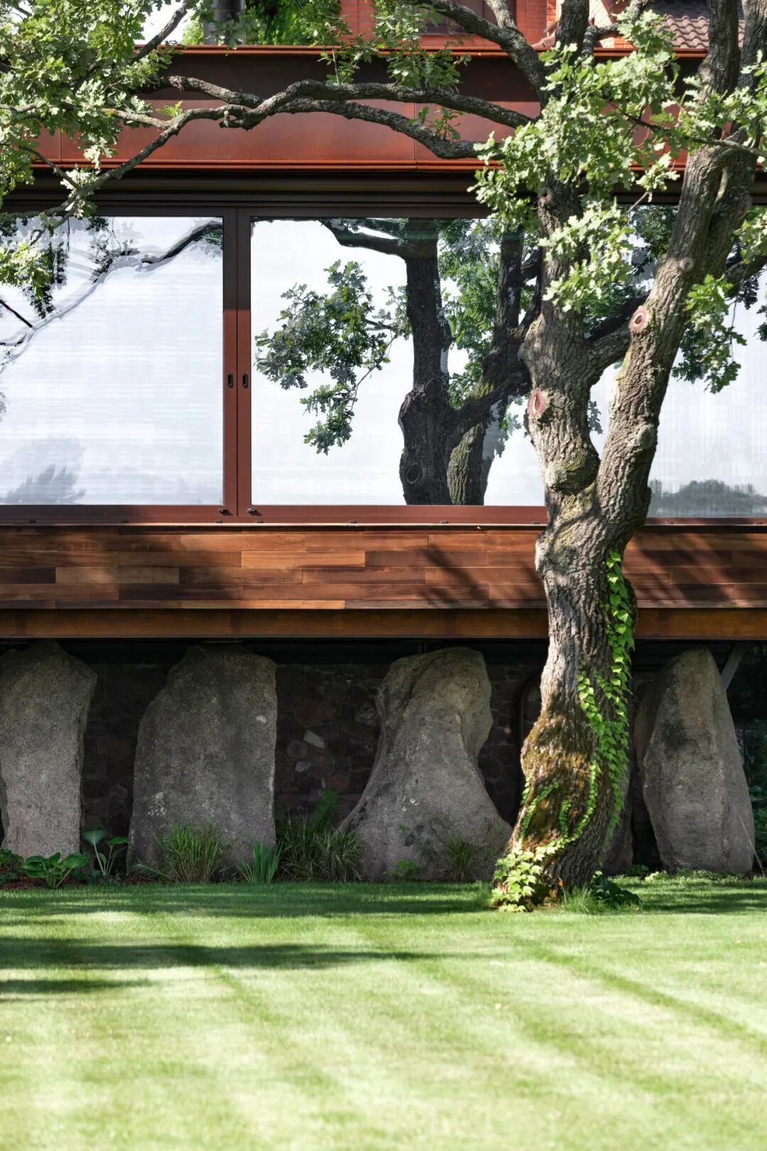 传统东方装饰品的金属屏风形成了用餐区的入口。一个重点的细节是一个悬停的开放式壁炉,这提出了一个选择的问题:是在外面平静的水面上沉思,还是在这里面燃烧的火焰上沉思。以花园和河流为背景的开放式壁炉与各种元素形成对比,可以在这里选择符合喜好的方式。