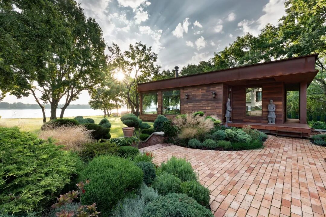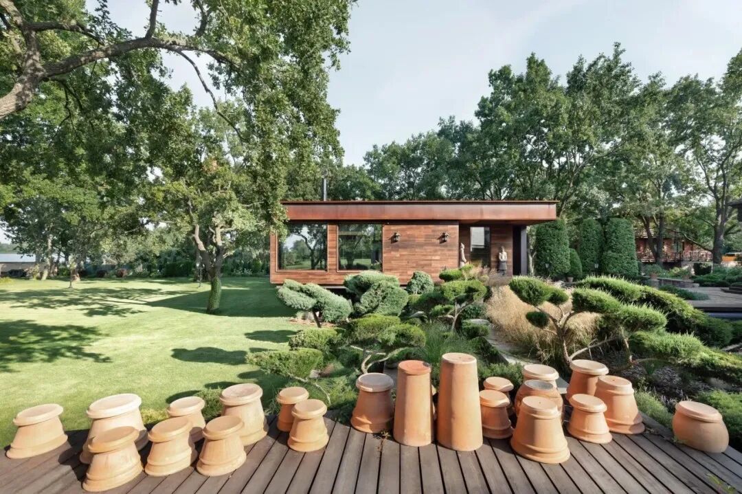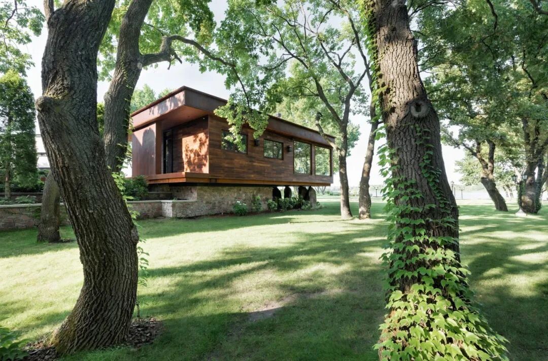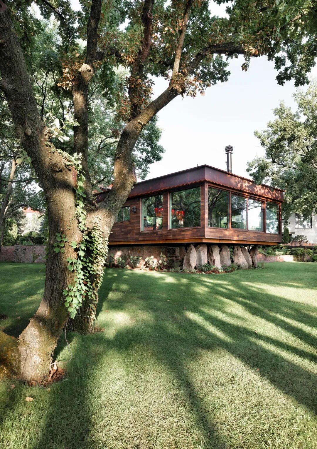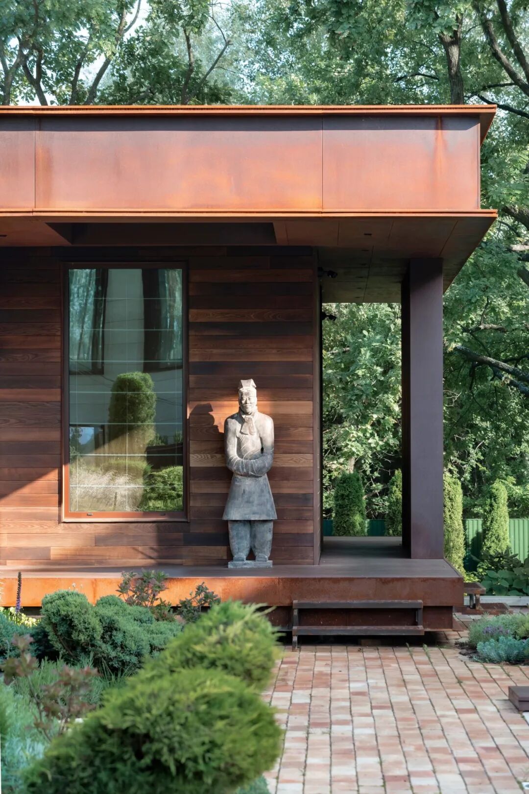 The building on stilts is elevated above the ground. The chalet's location adds a sense of lightness and enhances the observer's view of the garden from the premises. The decoration of the facade is made exclusively with natural materials: cor-ten steel, wood, and terracotta slabs. A robust background for the Terracotta Warriors is standing here.