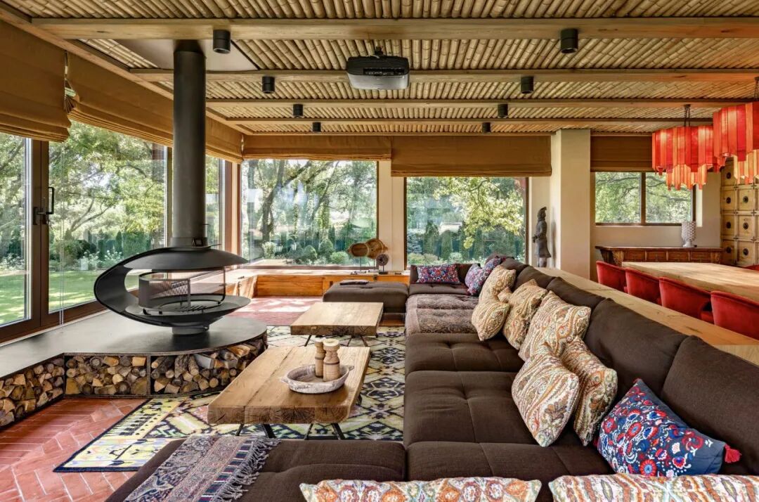 A metal screen in traditional oriental ornaments limits the entrance from the dining area.An accent detail is a hovering open fireplace, which raises the question of choice: a contemplation on the calm water surface outside or the living flame inside. An open fireplace against the backdrop of a garden and a river is a contrast of the elements, allowing you to choose a vibration that matches your feelings.