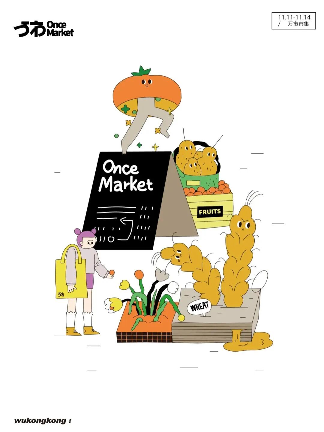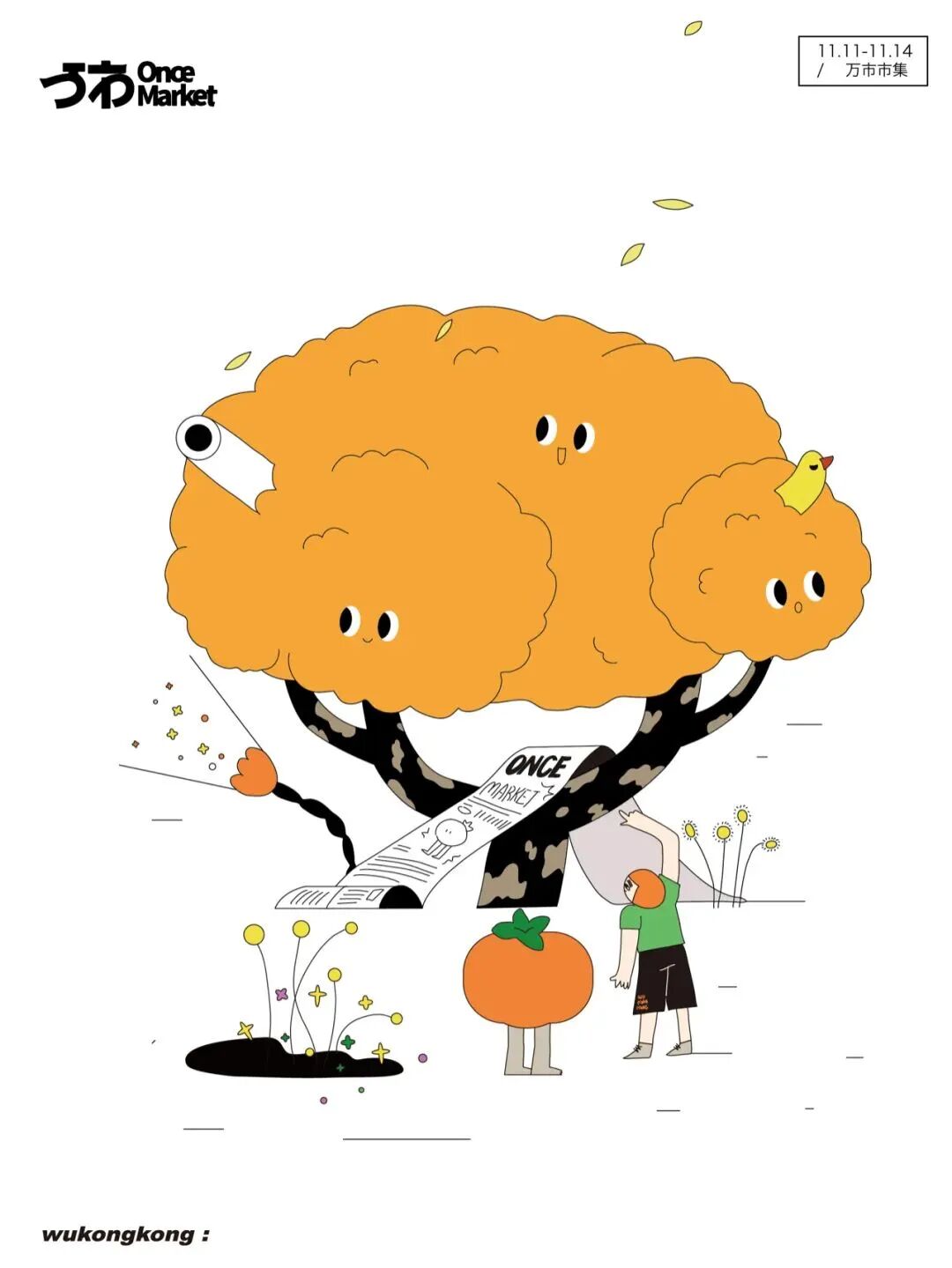 吾空空作为特邀插画师,与ZSDC为万市Once Market创作了IP形象——有趣可爱、寓意吉祥的柿子酱,从万物复苏的春天到野趣盎然的金秋,柿子也从青涩到慢慢成熟。