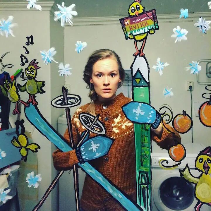 从2014年起,海琳·梅尔达尔开始尝试“物理美颜”,一部手机,一面镜子,以及一些绘画颜料,就是她使用的全部工具。首先,艺术家将自己置身于镜子前,规划好要描绘的图案以及位置,然后开始在镜子上涂鸦,创作一系列搞怪而有趣的场景。浴室自拍被海琳·梅尔达尔玩成了一场富有想象力的大冒险。