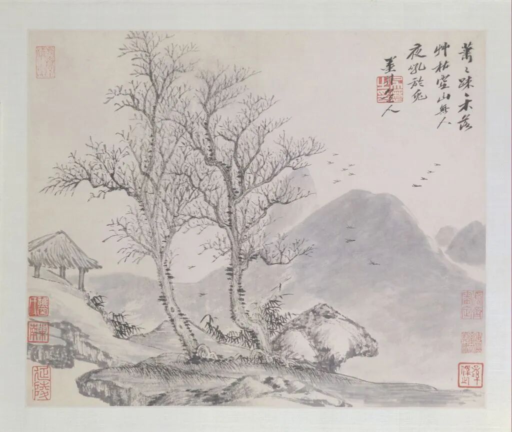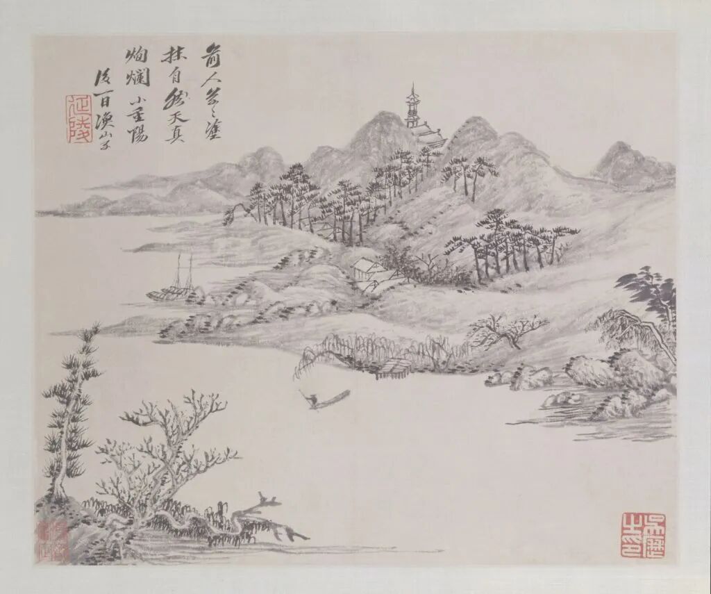 北京故宫博物院藏吴历《山水图》册,纸本,墨笔,共10开,每开纵23.2厘米,横28厘米。此图册布局饱满,笔墨苍拙,文人画气息浓郁,具有作者所追求的“神逸”韵味。无年款,从书画笔法来看,应为吴氏晚年画作精品。