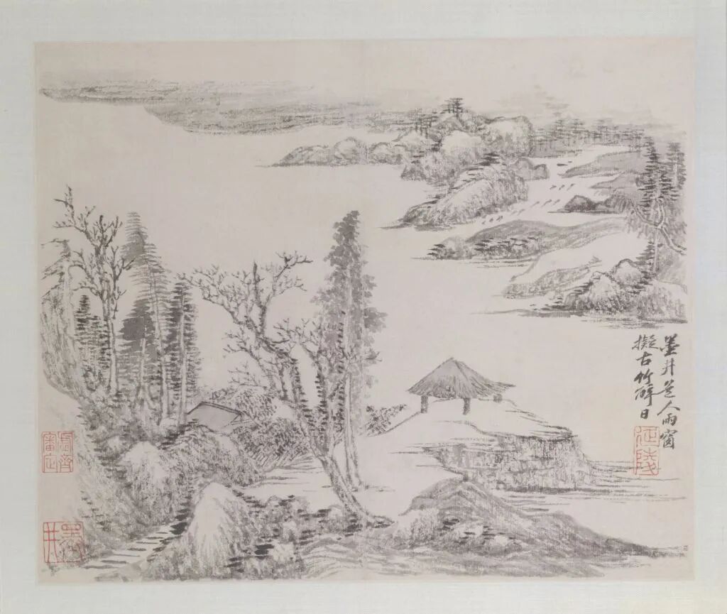 第五开:自识:“墨井道人雨窗拟古,竹醉日。”钤“延陵”、“墨井” 朱文印二方。