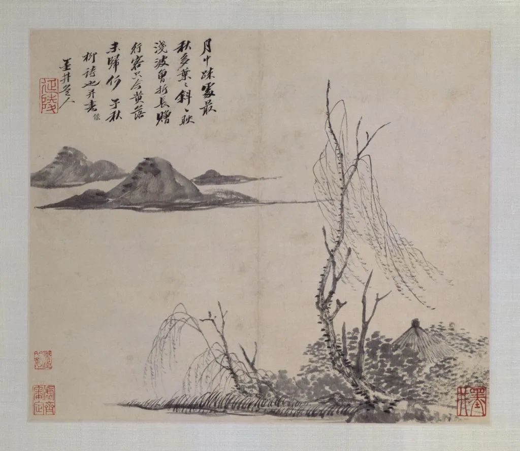 第一开:自识:“月中疏处最秋多,叶叶斜斜映浅波。曾折长条赠行客,只今黄落未归何。予秋柳诗也,并书。墨井道人。”钤“延陵”、“墨井” 朱文印二方。
