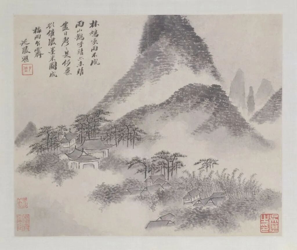 第三开:自识:“林鸠唤雨不成雨,山鹊呼晴亦未晴。尽日声声是何意,欲催泼墨米图成。梅雨乍霁。延陵历。”钤“吴历”朱文印、“吴历之印”白文印。