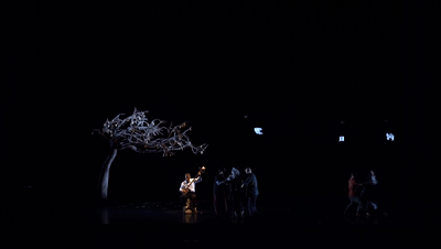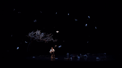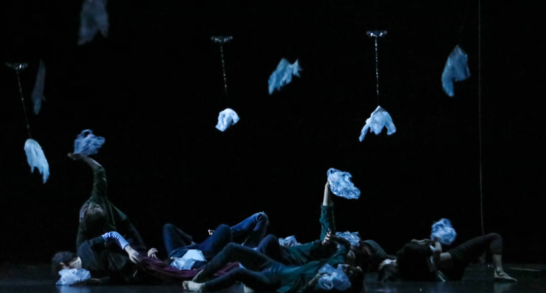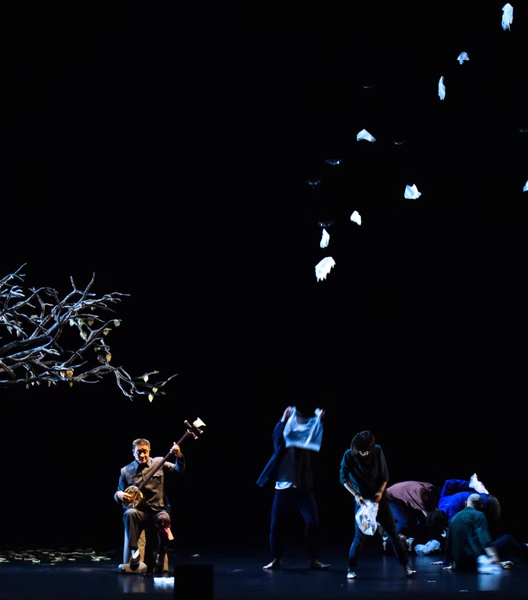 陕北说书老艺人独坐树下唱着传统曲牌《刮大风》,66 架 Lucie 微型无人机在舞台上安装的一棵大树上漂浮、扭曲和转动被伪装成塑料袋。灯光巧妙地将黑色无人机隐藏起来并突出纯白色的塑料袋。