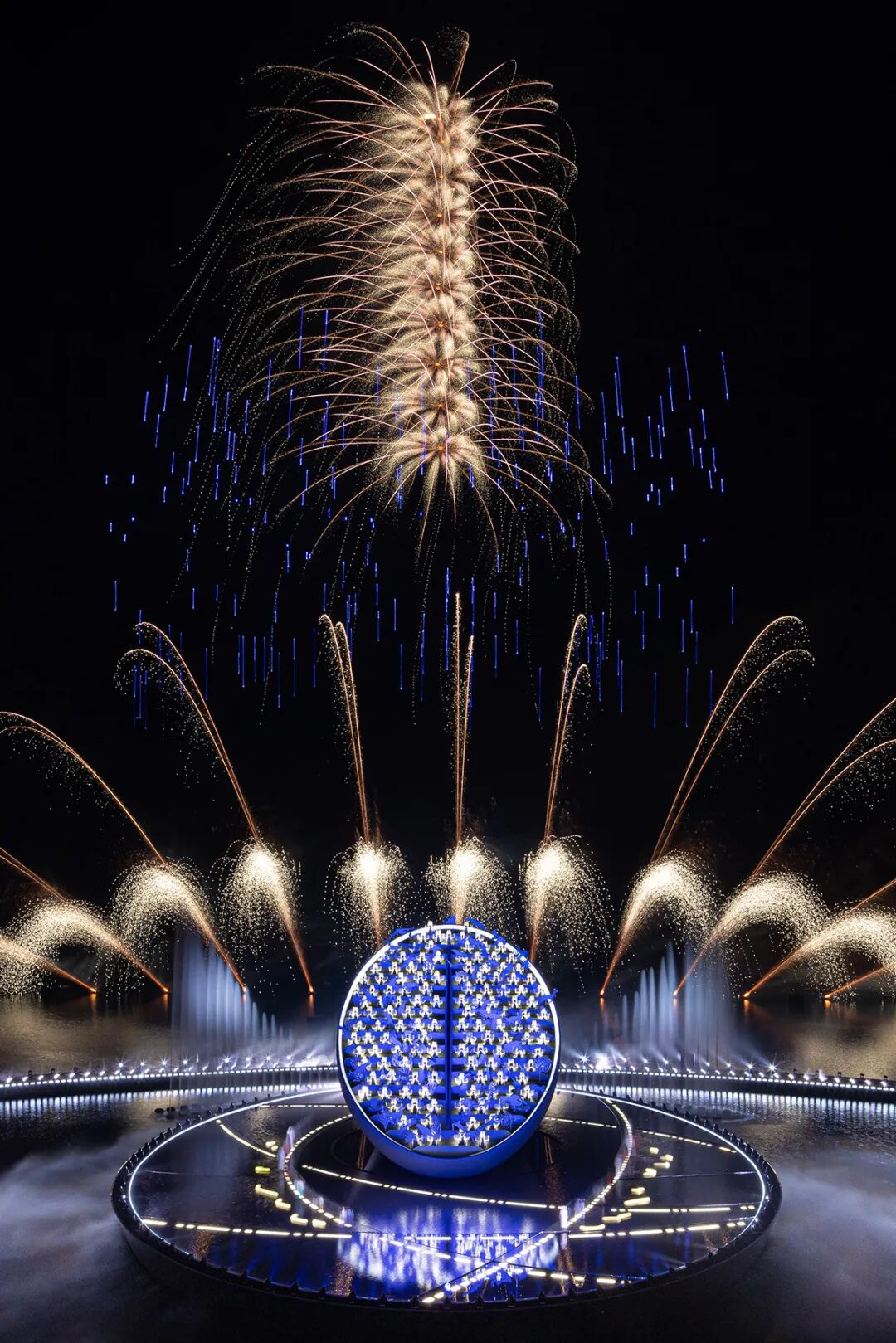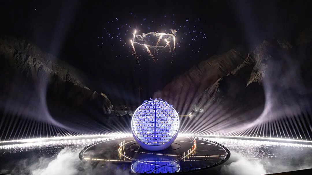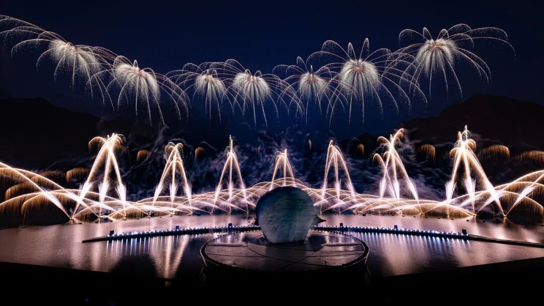 在演出接近尾声时,无人机载着光线,然后烟火从光线的末端喷涌而出。
