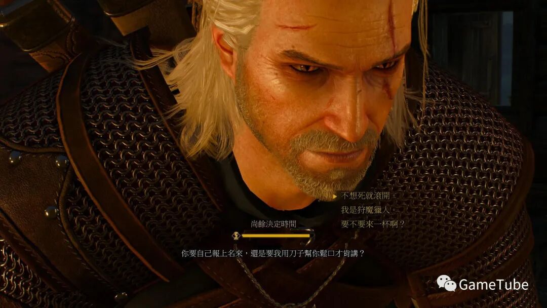 在游戏中玩家可凭心情做出选择,如下图e所示,面对强盗的挑衅骚扰,玩家有3种选择,经过我的测试。其中“不想死就滚蛋”直接导致战斗;而“我是狩魔猎人”导致强盗恐惧,结局和平;“要不要来一杯”是带有示好性的回答,后续剧情强盗继续挑衅,玩家可选择忍耐或回击;在本能反应“战”或“逃”上又增加了一个“和”,不同性格的玩家都可以根据心情选择。而倒计时的设计减少了玩家反复思考后果的时间,一方面符合剧情情节“面对挑衅,不会长时间的沉默,敌人也不会等待”;另一方面也让玩家遵从本心,尽快做出反应。