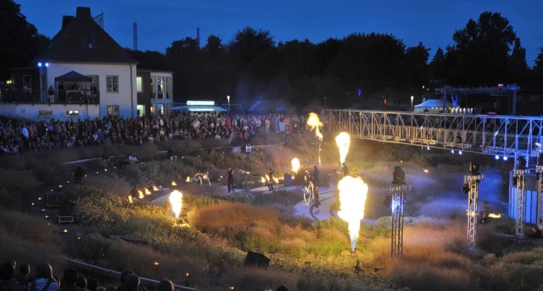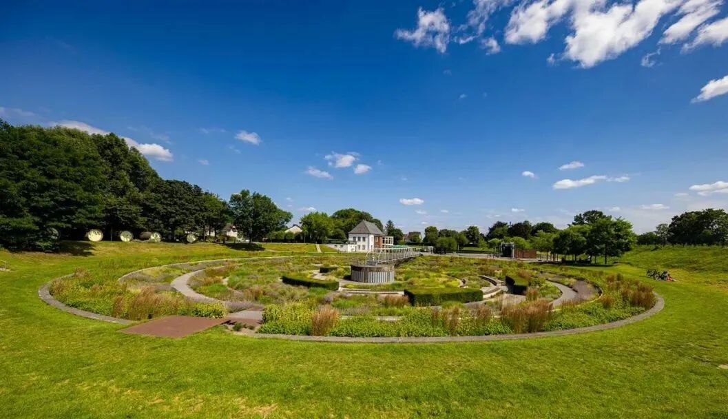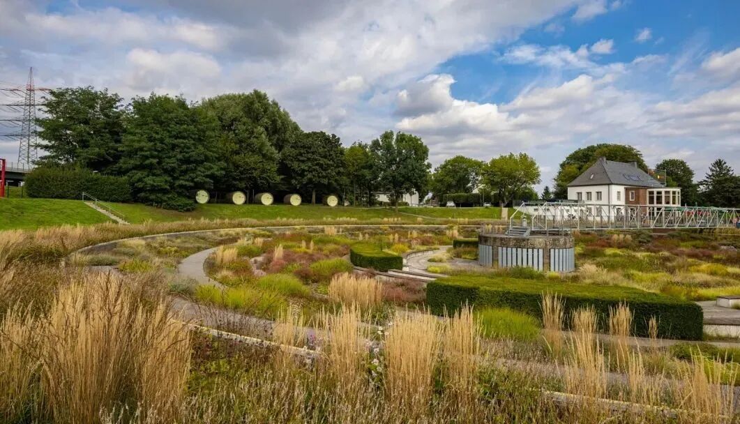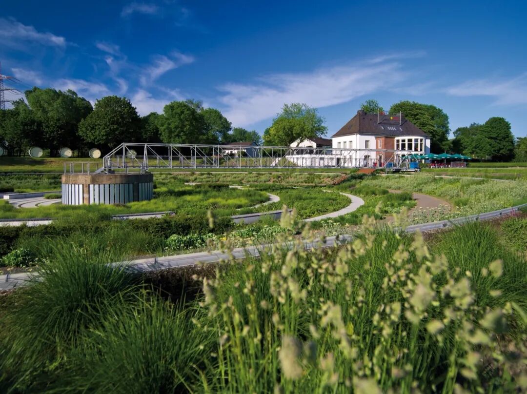 Where sewage once flowed up until the end of the 1990s, a wastewater treatment plant in the heart of the Ruhr area has been transformed into a flourishing landscaped park. The centrepiece of the site is formed by the two sedimentation tanks, which measure 70 meters across.