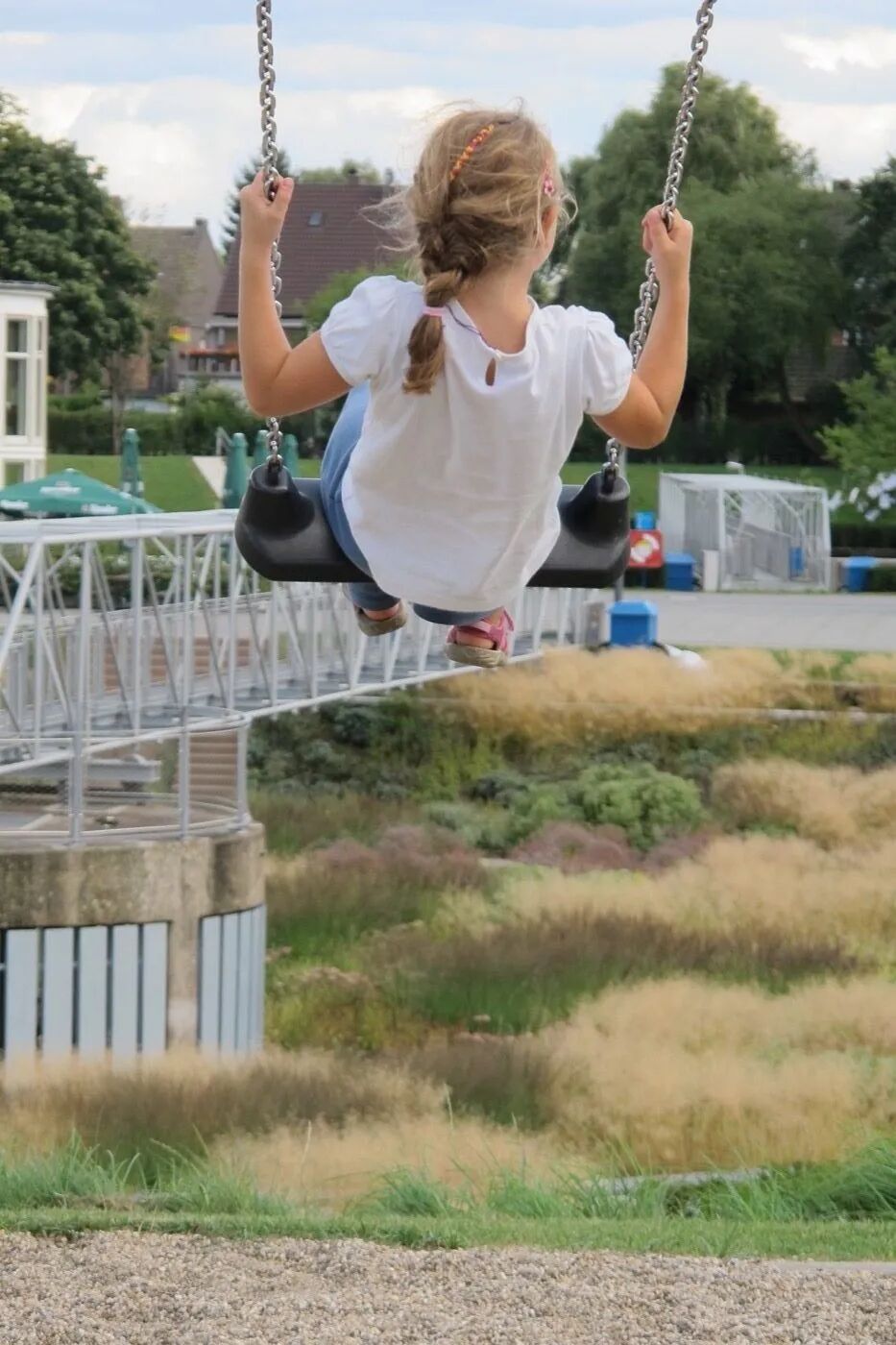 The building now houses a café and is a popular destination on sunny days with its hedge-ringed terrace. A playground with a slide mounted on the slope and striking red swings offering a view across the whole park completes the setting.