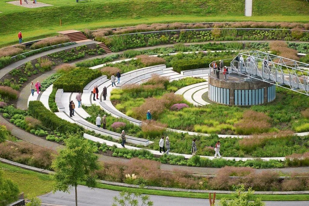 the second has been transformed into a sunken, terraced garden with more than 20,000 shrubs and grasses. The garden was designed as a “theatre of plants” in close cooperation with the artist team of Piet Oudolf and GROSS.MAX.