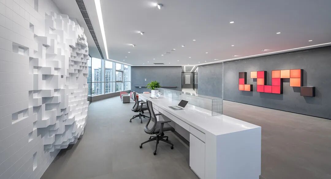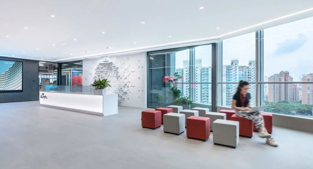虽说是为数据中心团队打造,但可千万别以为这里很沉闷。办公区域大面积使用乳白、灰调等色系,营造出简约明亮的超现代科技感。我们延续像素组合的设计逻辑到平面中,同时打破传统的竖直动线,而是“斜着来”,以此增添空间的趣味性,同时鼓励人们走动。