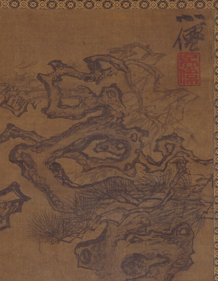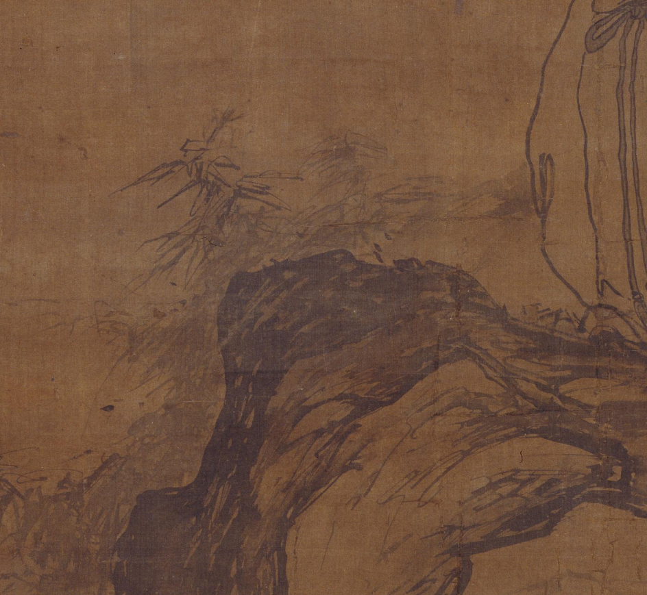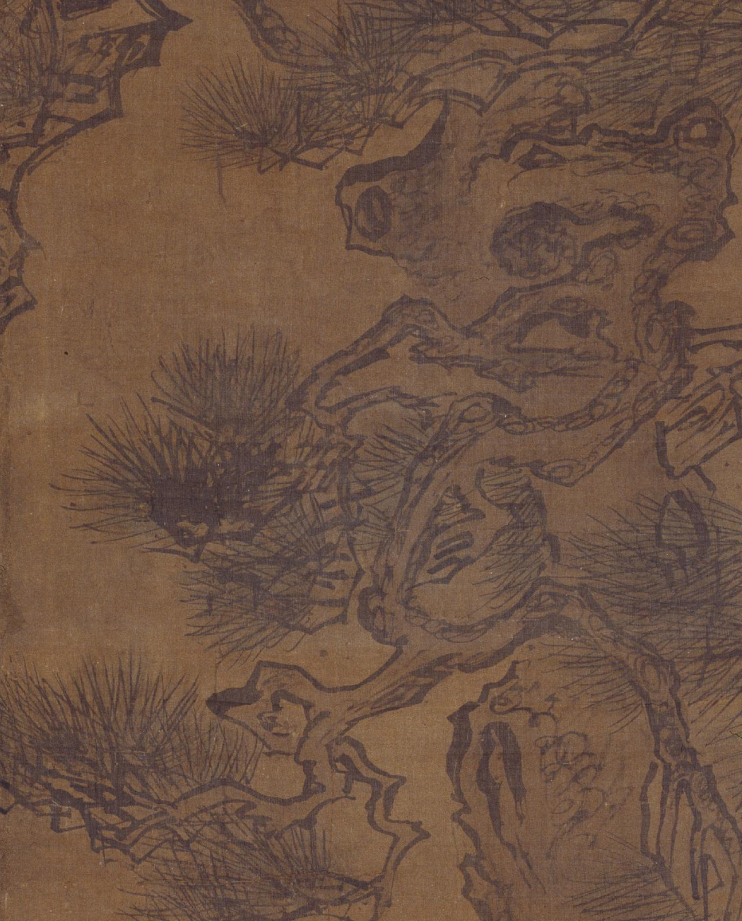 作品取“半边式”构图,将主体人物以及松树安排在画幅右侧,更加突出了左侧瀑布飞溅直下的气势。作者以沉厚顿挫的笔致描绘苍劲虬曲的松枝和睥睨万物的高士,墨气浓郁而笔力雄健,不仅达到了衬托和譬喻人物性格的目的,而且也与左侧长而直的线条取得了一种视觉的平衡。同时,作者也注意细节的刻画,如人物的五官、神态以及手中的诗卷,无不传达出作者对放逸自由的生活的憧憬,代表了吴伟晚年人物画的风貌。