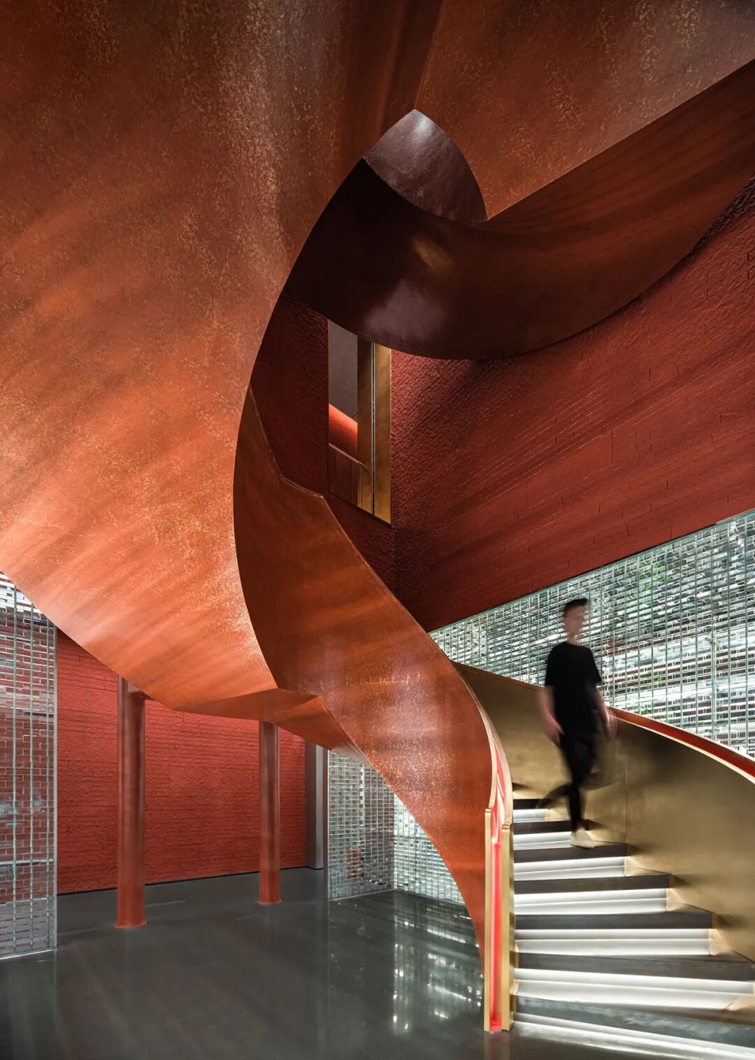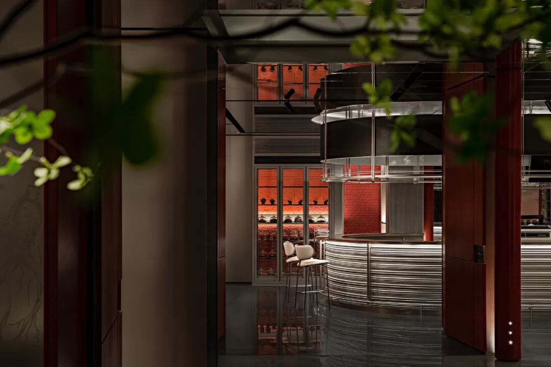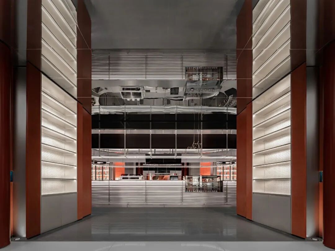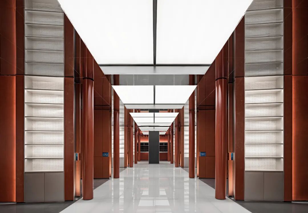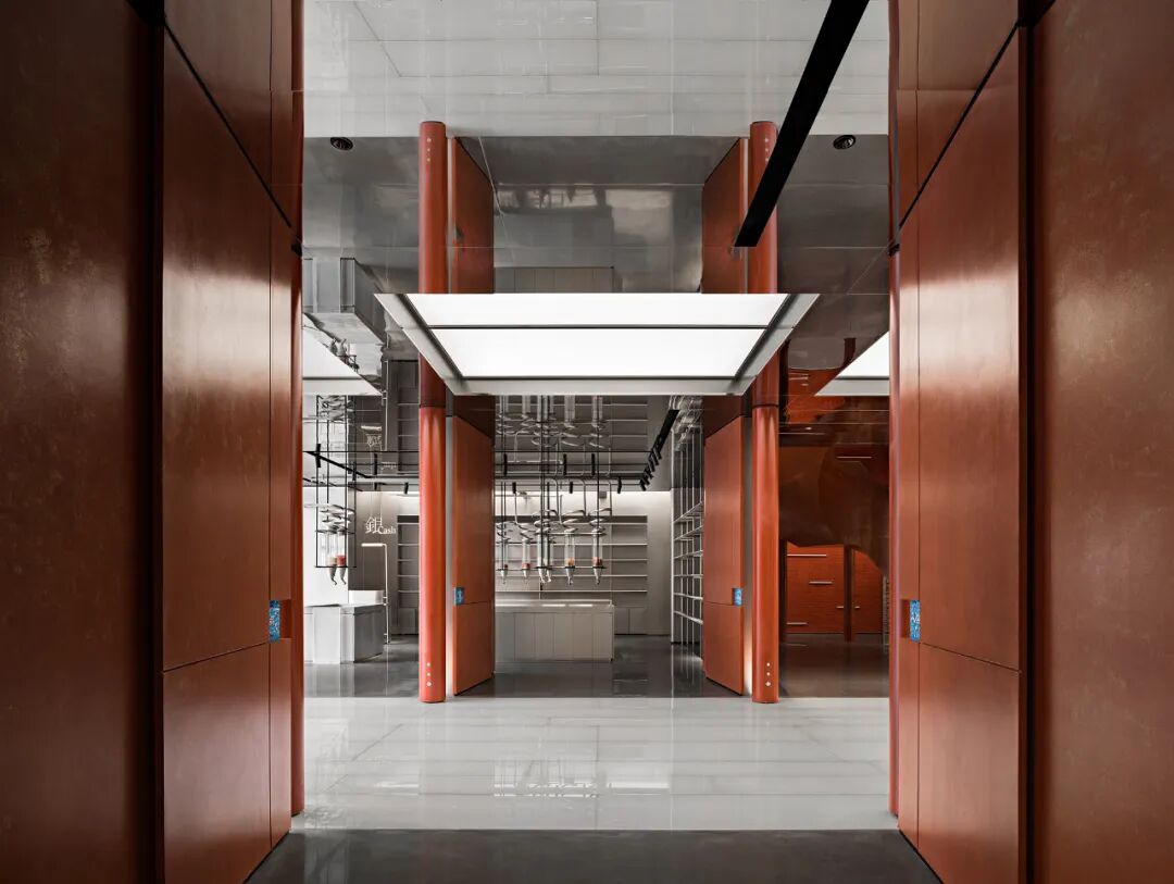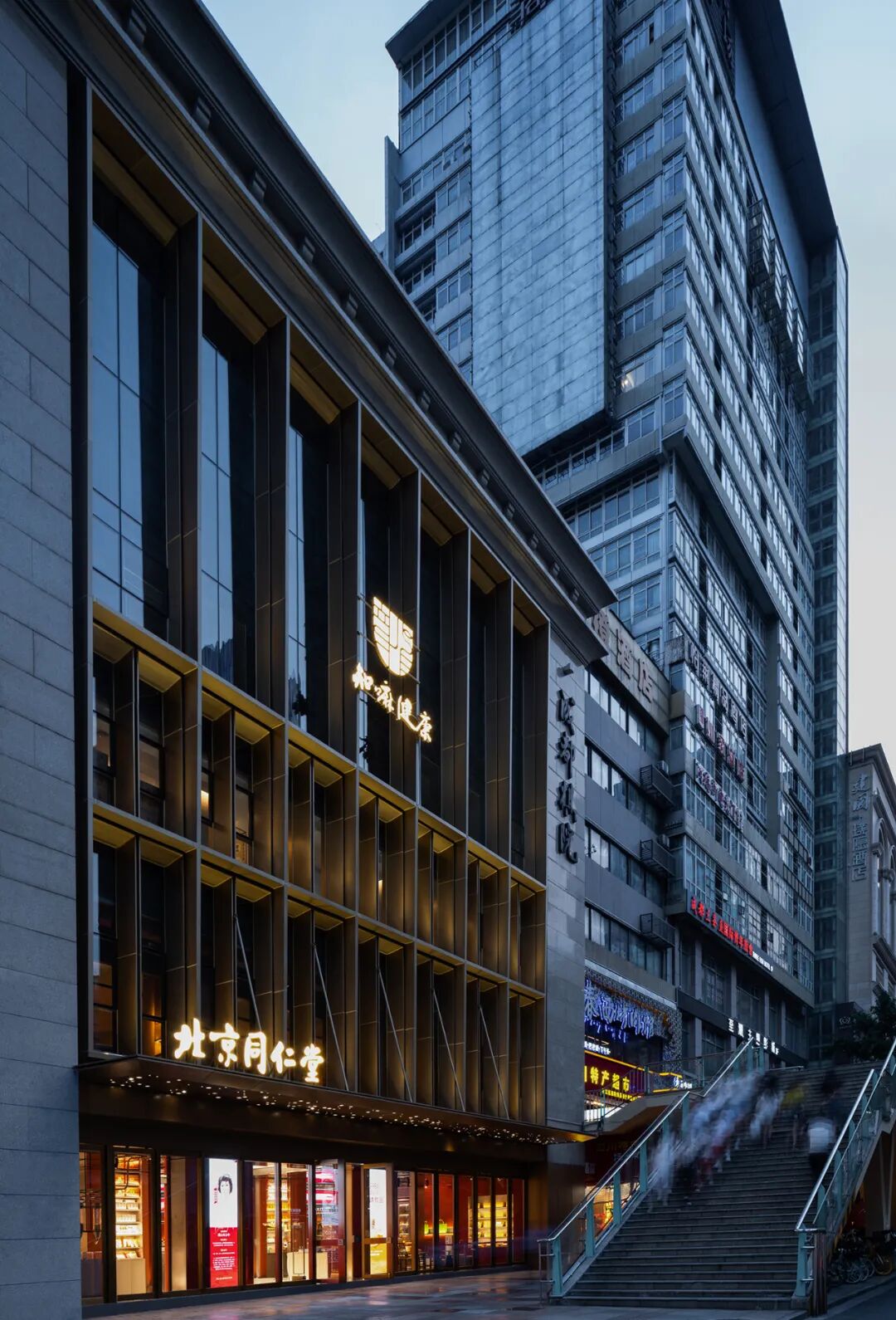 去年8月,成都春熙路与总府路交汇处,同仁堂知嘛健康西南地区首店落成营业,WUUX 无象空间完成内部空间设计以及建筑的外立面改造设计。空间设计逻辑遵以东方礼序展开,严整的中轴线对称布局在人潮涌动的春熙北路起点打开一条步道。12 根朱漆柱廊与玉色故宫御道形成舞台剧式的空间场景。