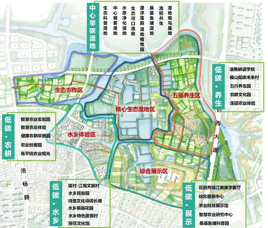 新规划延续地区生态水绿格局,保育生态本底,守护河湖美地,构筑湖荡、河流、径浜、圩田、密林多位一体的生态网络,提出了塑造城水融合共生新江南的思路。通过对城市河流水系和生态空间的有机组织,形成内疏外密的组团式空间布局,呈现“内疏外密、东城西野”的组团式空间布局,形成“两心三轴、三廊五片“的功能结构。