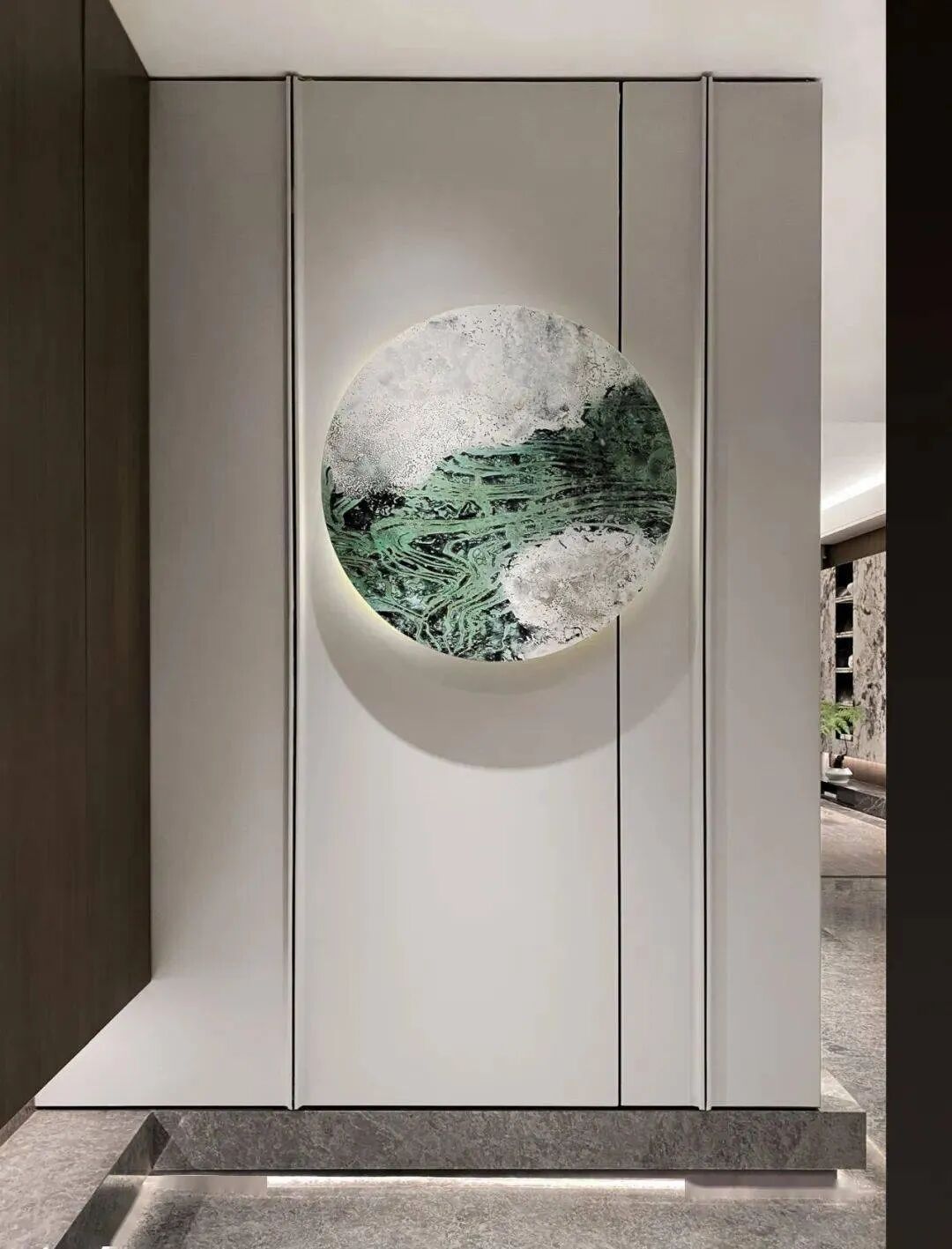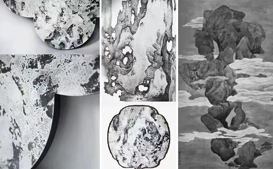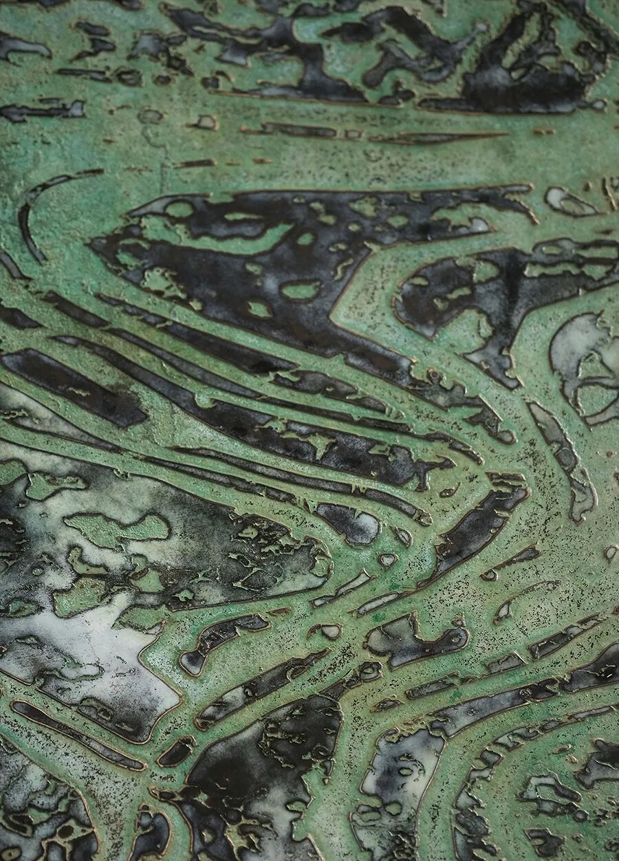 《行云流水》,作品以铜为媒介,黛色晕染,勾勒西山静翠湖的行云流水之境,于方寸之间尽显高山流水觅知音般的热爱及福源长寿的美好寓意。