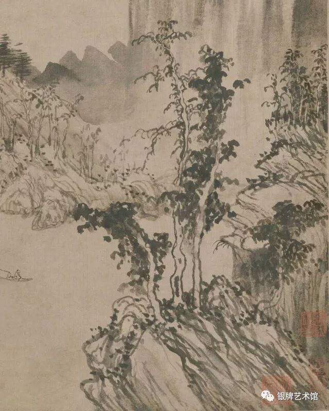 画面右侧一峰高耸,峰下水中一叶小舟徐徐划行,岸上怪石嶙峋,林木丛生其间。笔墨浓润,酣畅淋漓,山体用纵向长线条皴染,以增其峭砺高耸之感。