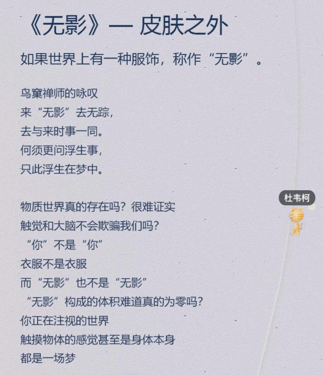 如果世界上有一种服饰,称作“无影”。皮肤之外,是实实在在的衣服,是皇帝新衣,还是大脑接受的信息,还是……透明的新衣是不是真的不存在,没有任何方法可以证实这一点。