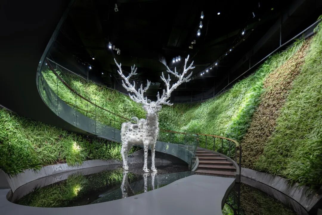 在展览的末尾,围绕着艺术家名和晃平巨大的水晶鹿艺术作品,竟然还摆脱日光的桎梏,布置了一片“地下花园”。
