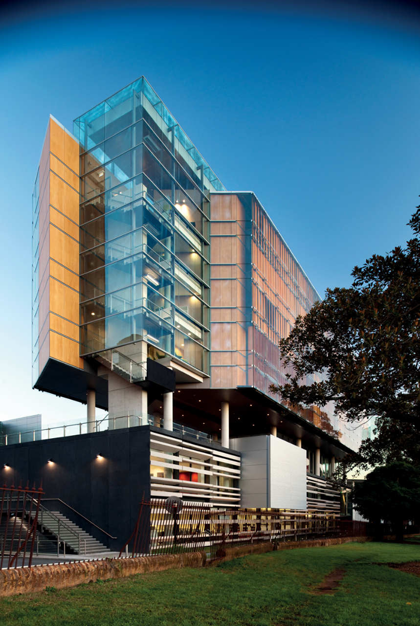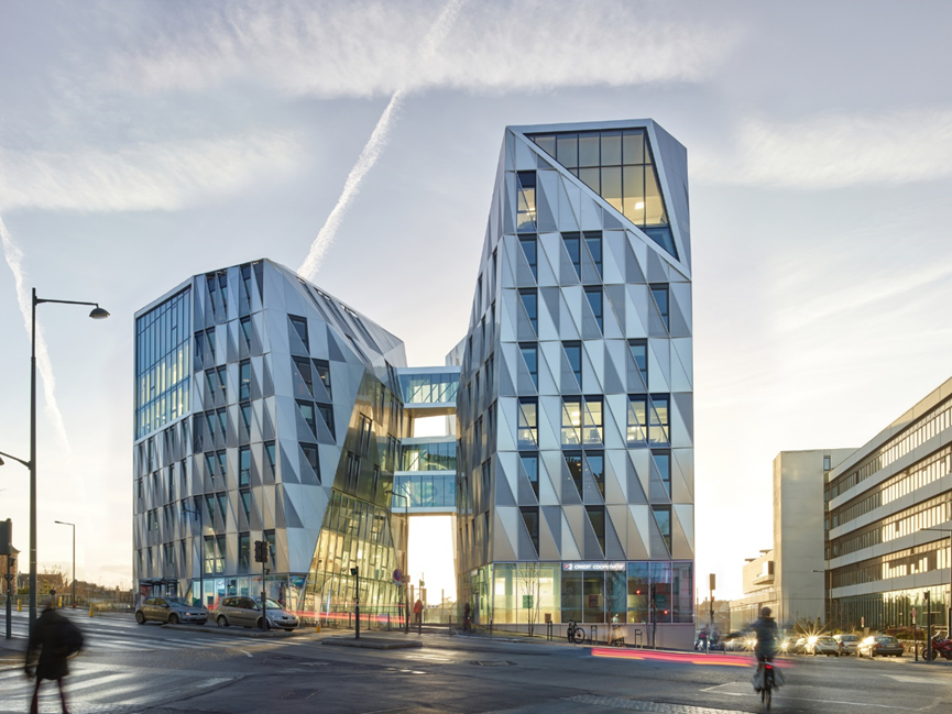 在法国梅隆的音乐学院,石板与金色的闪亮涂层形成对比。根据建筑师的说法。"矿物平坦的立面,消光且粗糙,被长条的斜削雕刻;