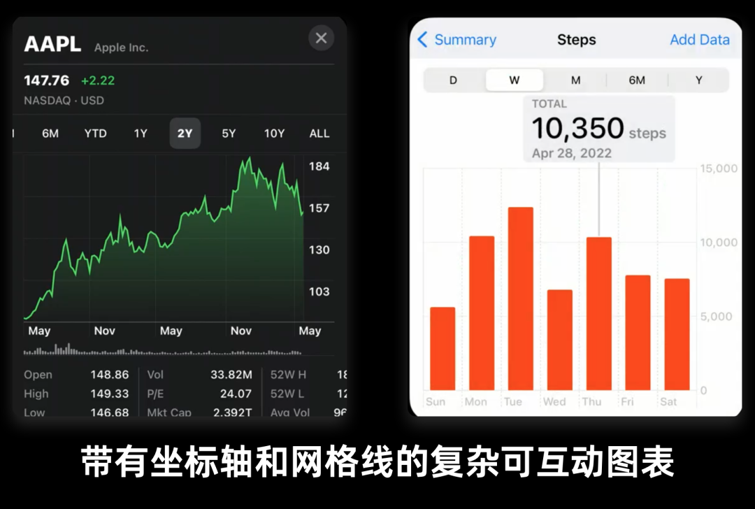 可互动图表尺寸比静态的缩略图表更大,也因此能展示更多的数据细节。比如股票App中的股票走势图表、健康App中的步数图表。一般可互动图表的宽度会占满整个视图(view),但高度可以调节。