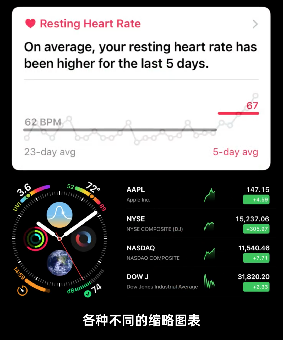 缩略图表一般来说是静态的,比如说健康App卡片上的图表、Apple Watch表盘上的图表、股票App列表里的小图表。缩略静态图表很少单独出现,它们一般是另一个页面里的完整图表的预览。也因为他们尺寸小,用户看见这种图表的心理预期是点按进入下一页才能看见完整图表,所以缩略图表不需要添加网格线或者文字标签。