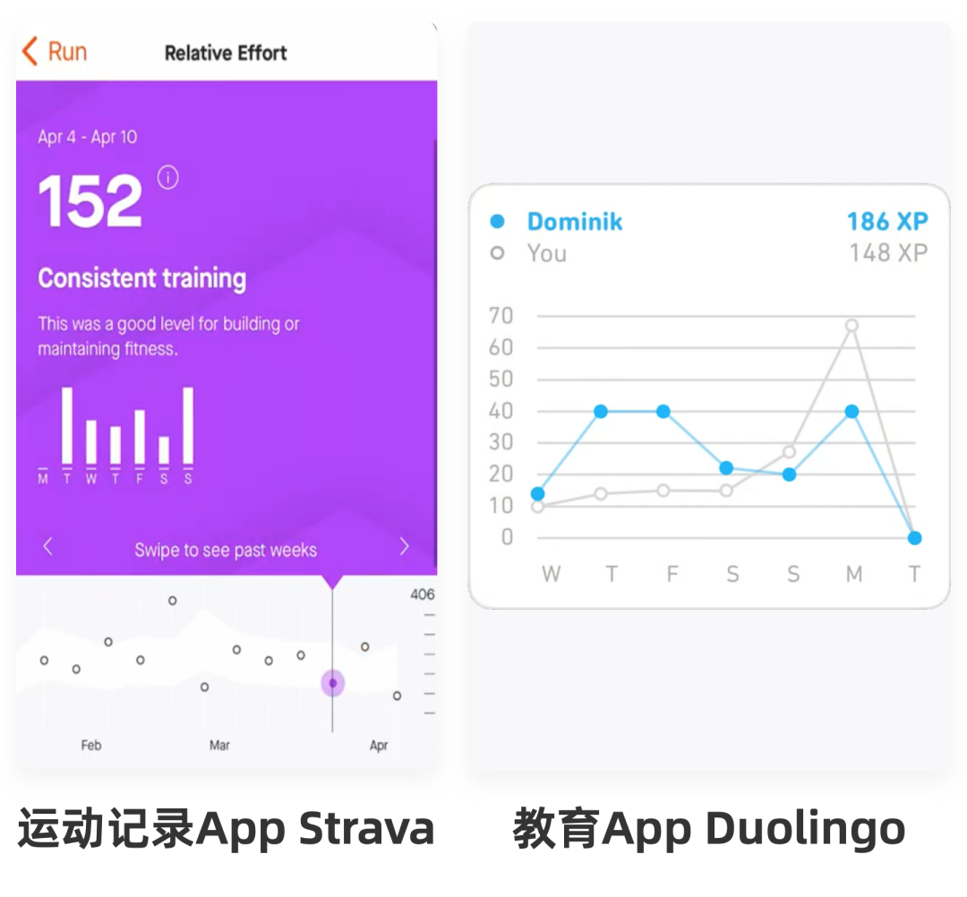 除了苹果的内建应用,市面上很多产品也都在创造性地应用图表。比如跑步/骑行记录应用Strava用图表来记录每日的运动数据;语言学习应用Duolingo用图表来展示用户和朋友们的学习经验值变化。