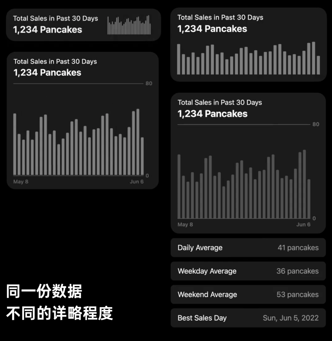 大多数苹果产品发烧友会比较关注WWDC上硬件产品的更新。但实际上WWDC还会详细介绍苹果的设计、功能上的迭代,这些东西不仅对日常设计工作有启发,也一定程度上是未来一年交互设计的趋势风向。本次咱们就摘取其中数据可视化相关的两个视频来看看苹果设计师的设计思路。