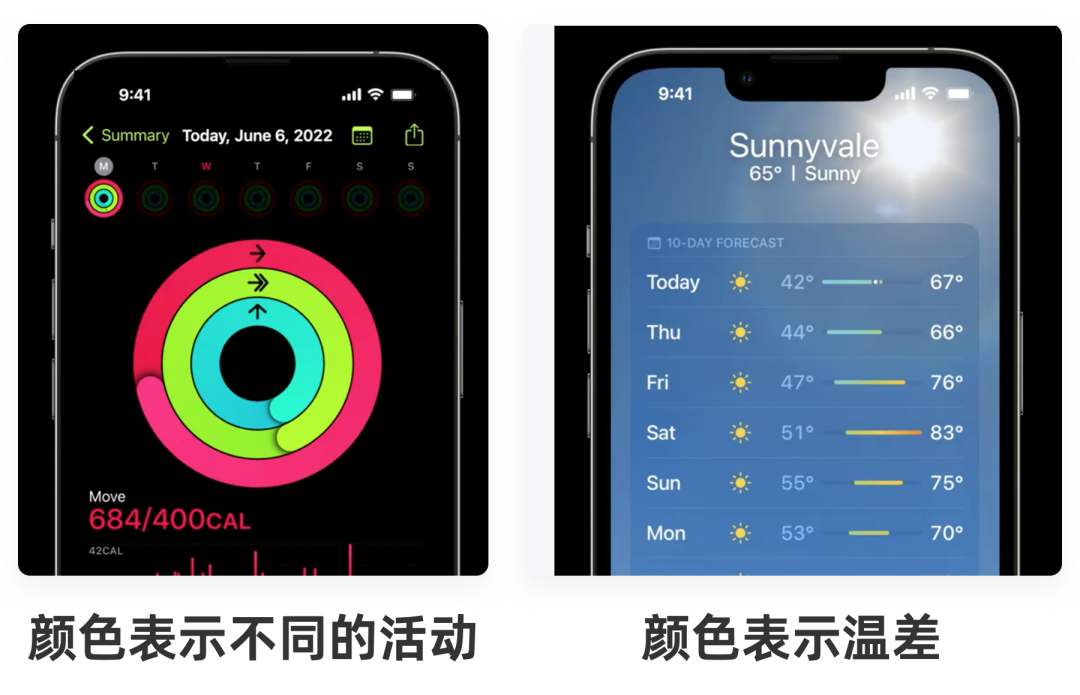 颜色可以用于区分图表中的不同的类别。比如“运动”app中用3种颜色代表3种不同的行为。颜色还可以用来表示强度,比如在“天气”app中颜色表示一天的温差变化。