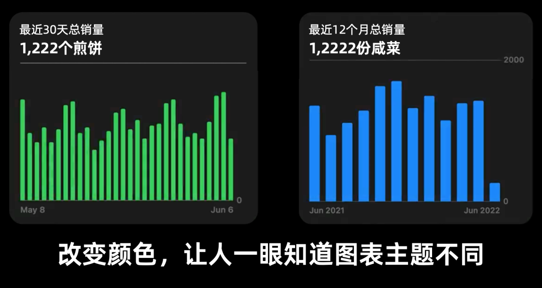那假如左图是过去30天的煎饼销量,右图是过去12个月的咸菜销量呢?这样光改变文字和柱子,可能就不太容易让用户意识到这是两个不同主题的图表。