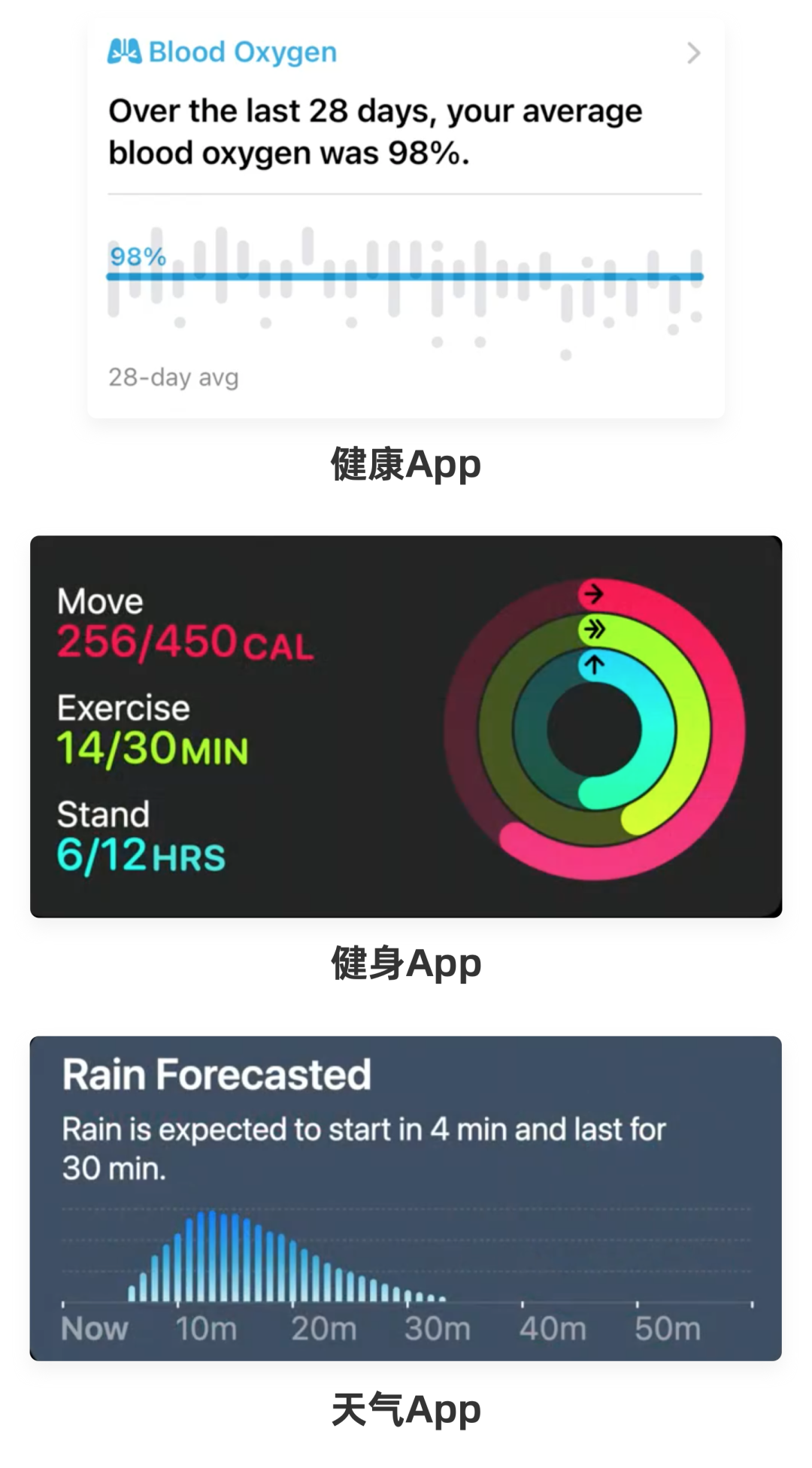 图表可以很好地传递复杂信息,在苹果的很多产品中都可以看到图表的身影。比如苹果的内建应用健康App用图表来展示人的身体健康情况数据、健身(又称活动)App用三个圆环构成的图表来提醒用户每天都要运动,而天气App则用图表来表示预测降水量,帮助用户提前进行出行决策。