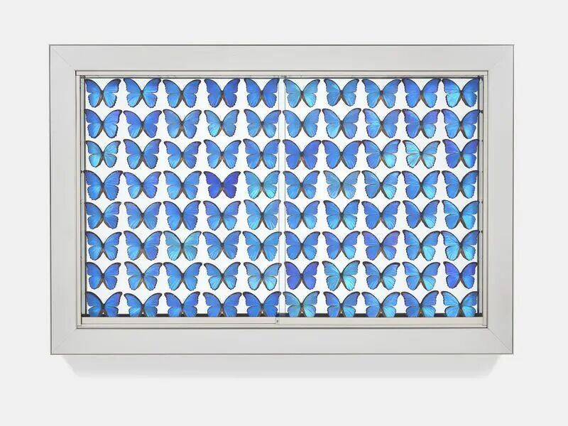 Mother of pearl, acrylic paint on wooden base panel, stainless steel frame