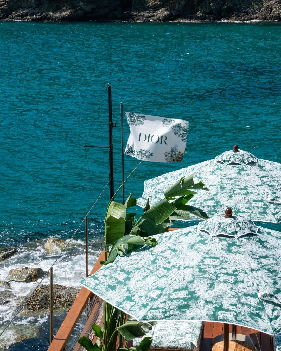 2. Dior海滩俱乐部,将亲近海岸的私密海滩俱乐部Bagni Fiori切换到Dior模式。升起Dior旗帜、撑起Dior“茹伊印花”遮阳伞、并搭起Dior海滩小屋。