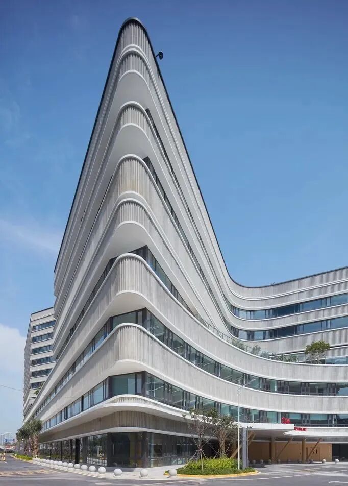 柔美的弧形建筑为医院户外提供了独立的产科花园、妇科花园、住院花园甚至下沉园林; 从入口开始产科与妇科便各具动线,互不干扰。建筑错落有致的曲线更为各层内部空间引入近身的空中花园。