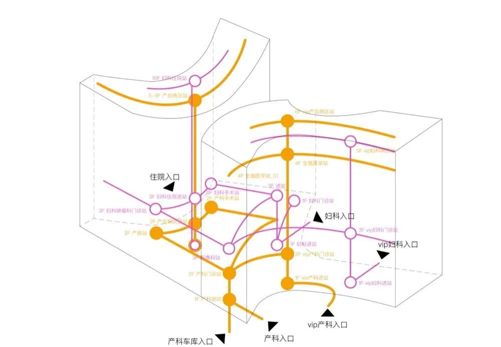 急救可通过医梯直达手术,手术与ICU同层紧临。消供中心与手术区设专用的洁梯与污梯,手术与病理上下对应,可快速传递生物样本。地下药品基地及洁净物品设卸货区,与洁物坡道连通。药品通过物流系统送达门诊分层药房、急诊药房、产房区、手术区、NICU、ICU及病房区。