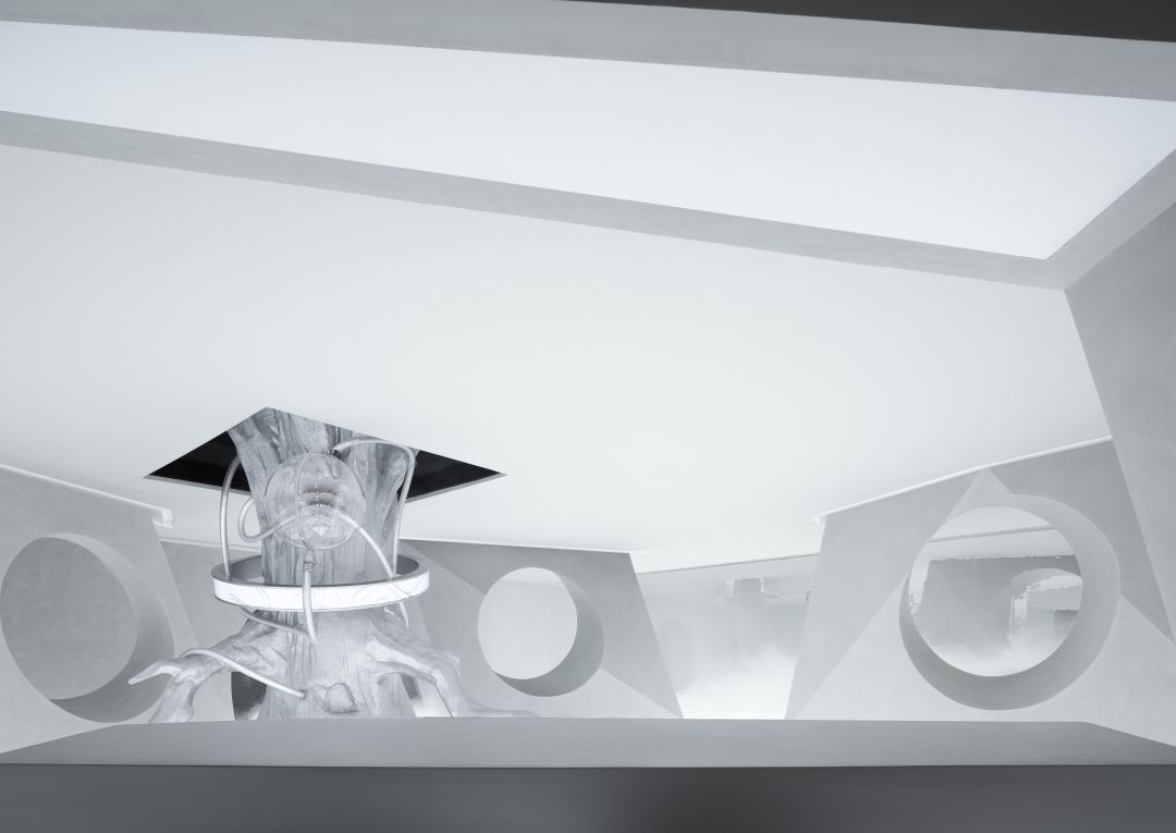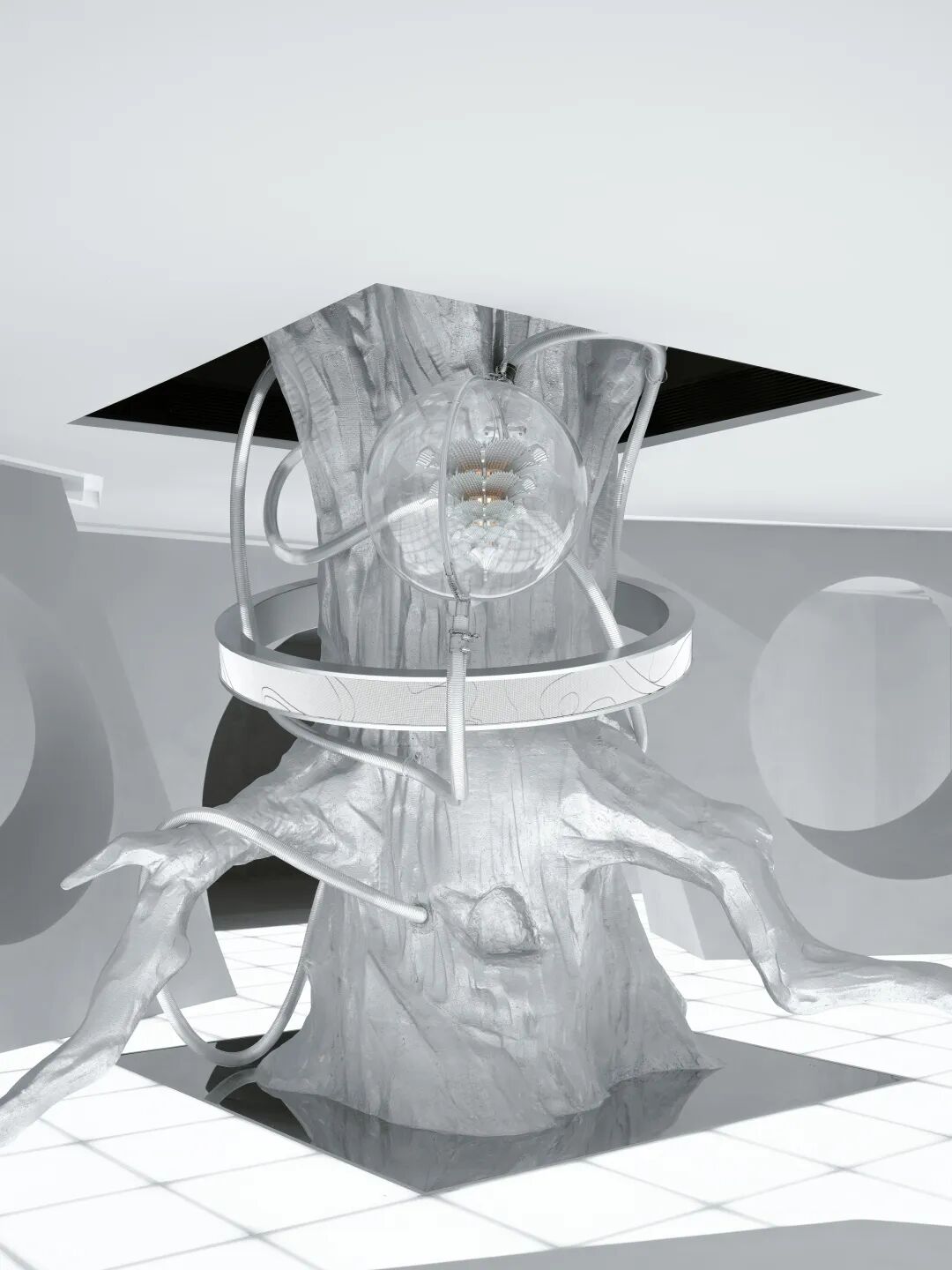 惊喜与意外观感也随之而来,一棵穿过天花板的大树,它究竟要通往何处——或许是另一个平行世界,总是引人无限遐想。未来感造型环绕在树周围,自然与科技的结合尤为惊艳,犹似蔓藤与走兽的灯饰装置缠绕而上,抽象的艺术概念效果即刻达成。