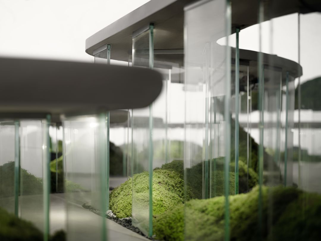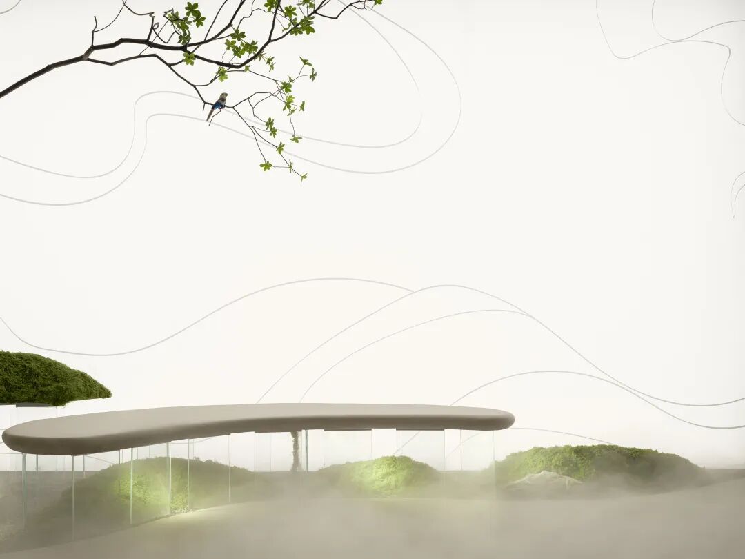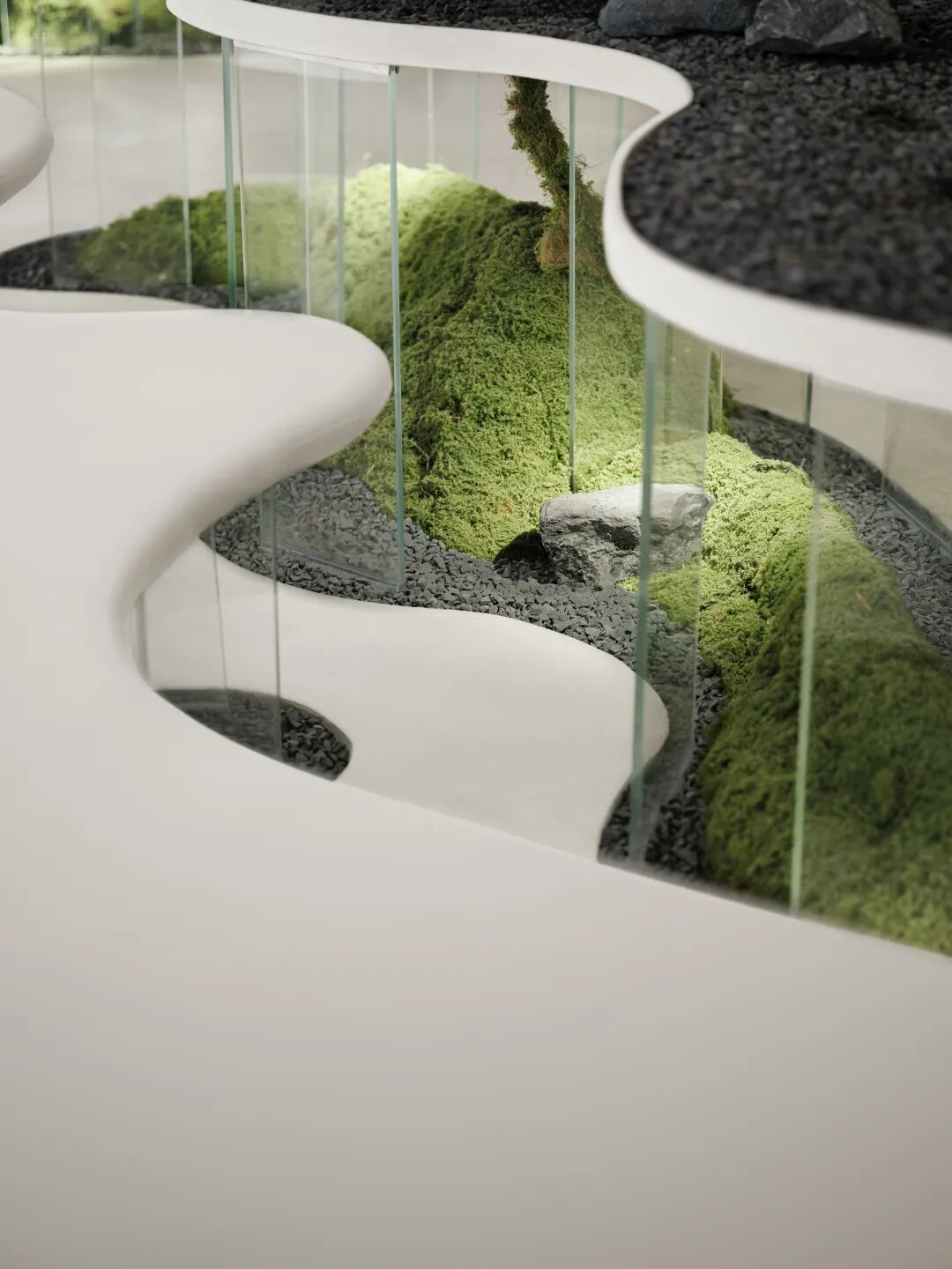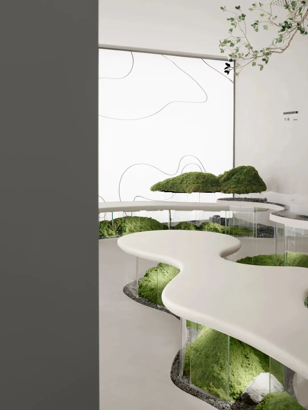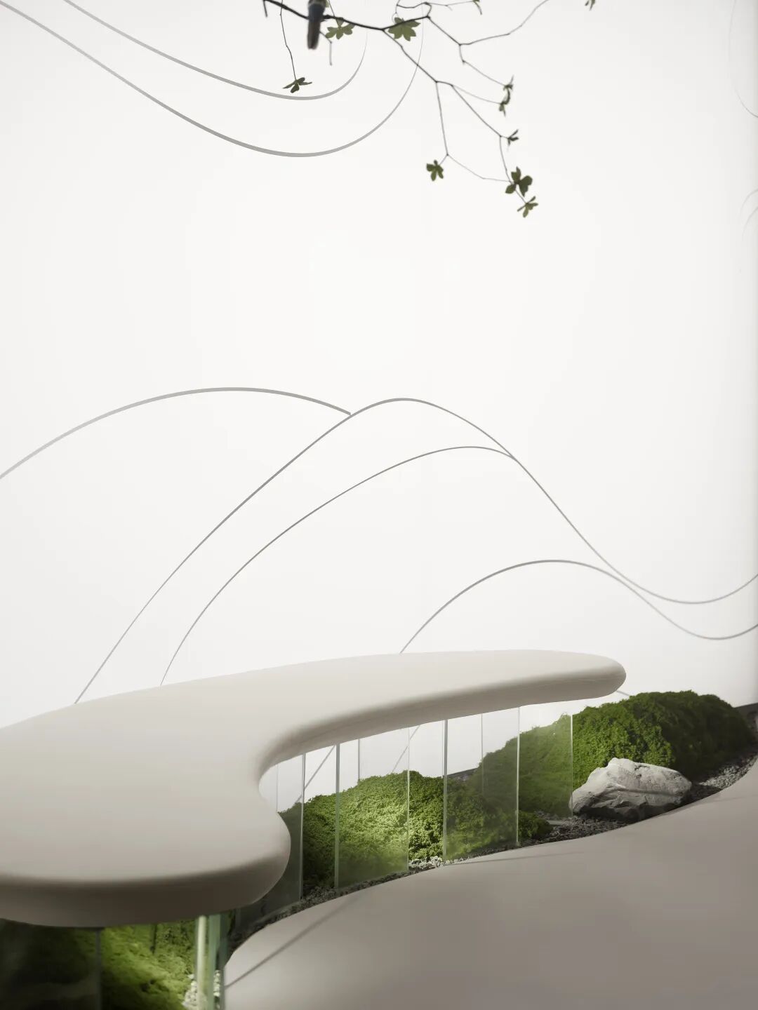 以沙丘为设计灵感的座椅搭配透明亚克力材质创造悬浮之效果,其走势则蜿蜒流动,犹如无形之风拂过而留下的痕迹。青绿苔藓向阳生长,自然的起伏形态为空间纳入更多活力,与摇曳的竹影相映成趣,生机盎然,清新和煦,令人置身其中也无比轻盈愉悦。