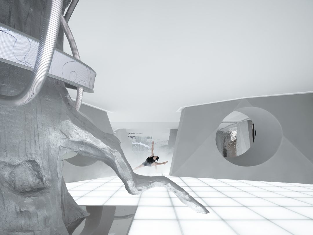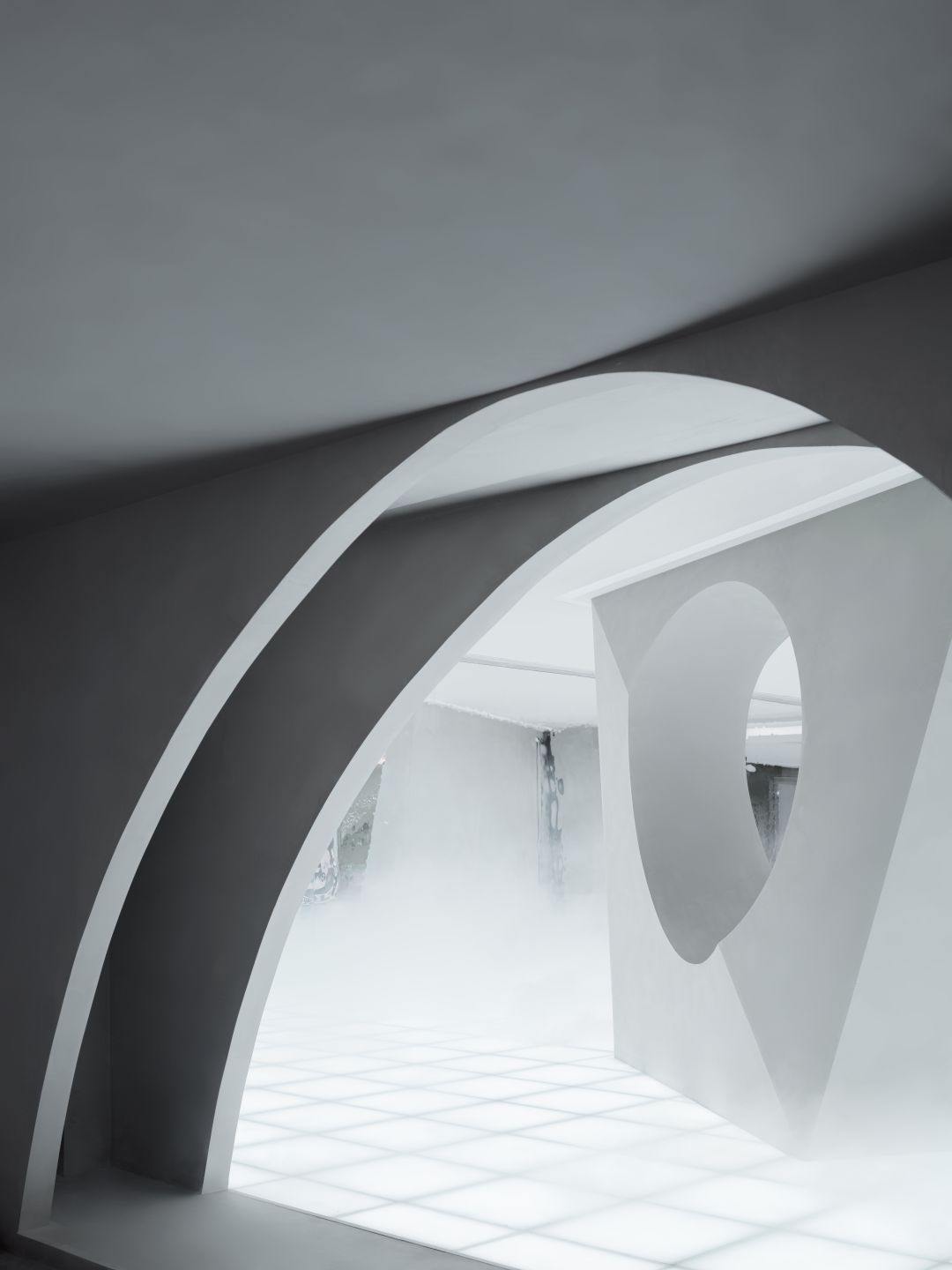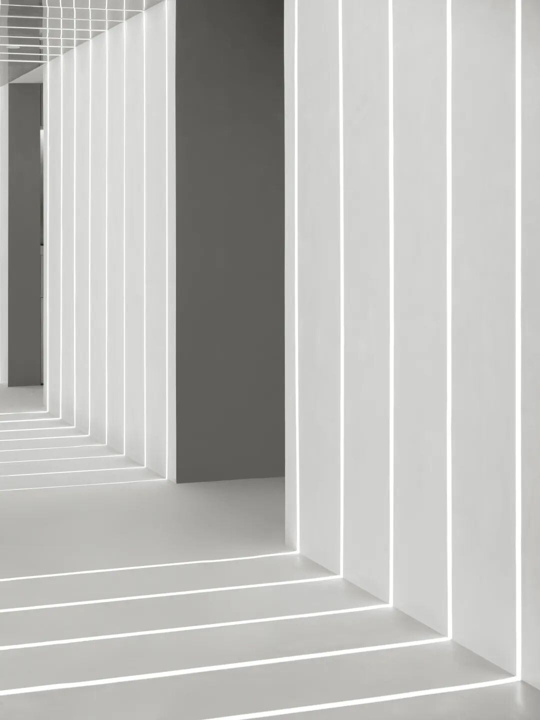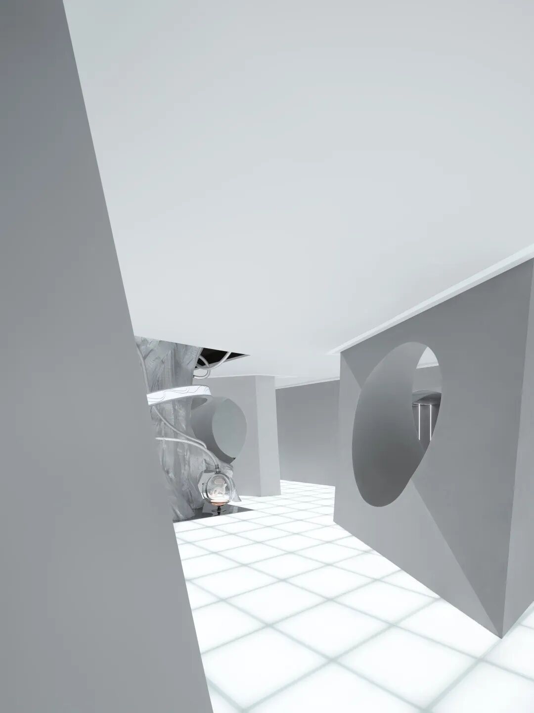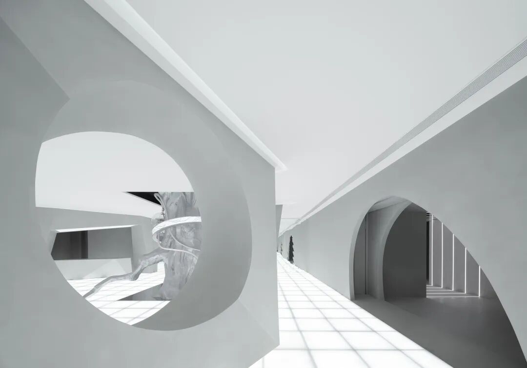 走廊通道利用光线和镜面材质营造多重空间感,无限延伸的尽头蕴藏着难以抗拒的吸引力,过去、现在、未来、梦境、现实相互穿插交替,预示着未知的结局。