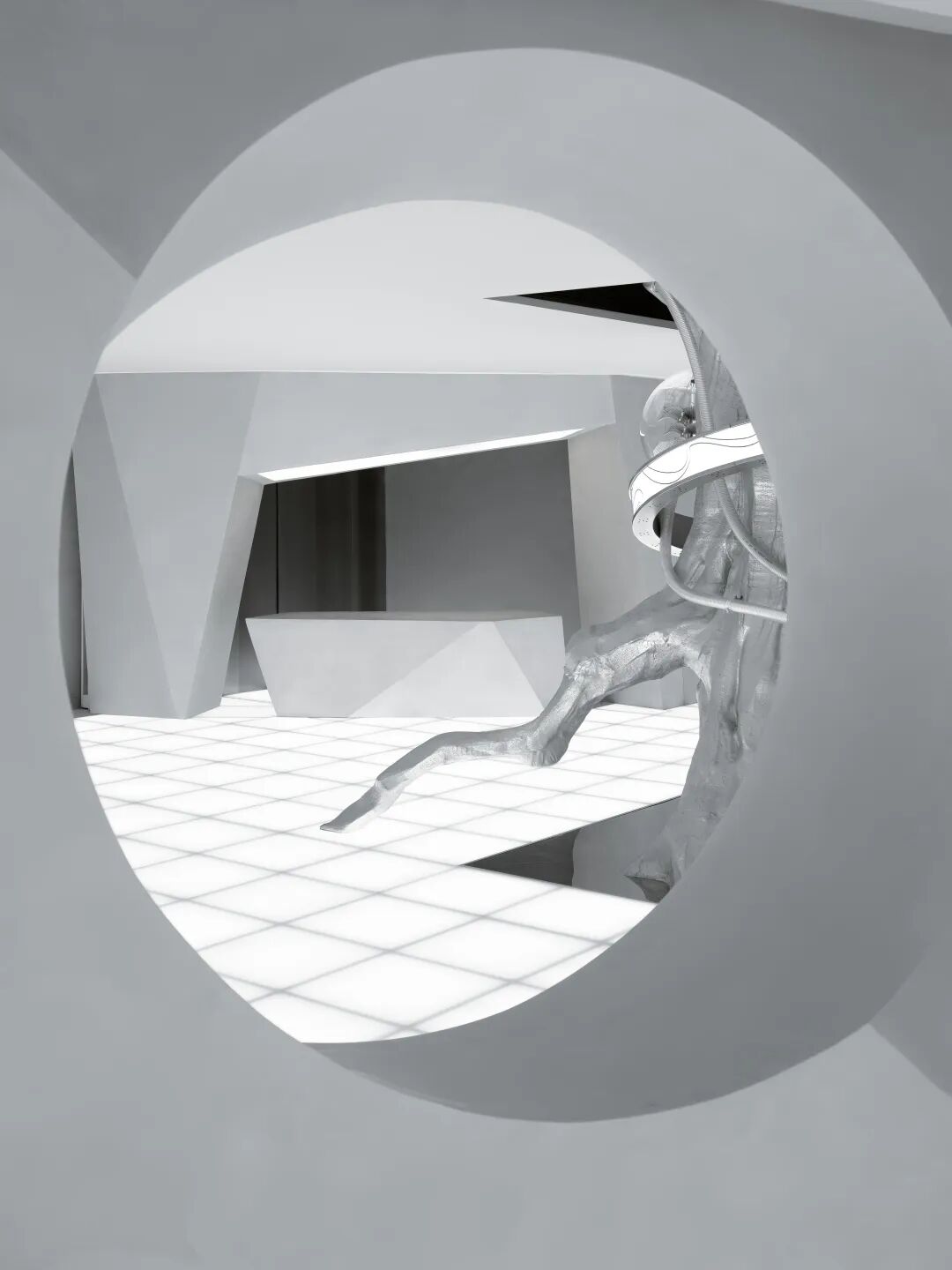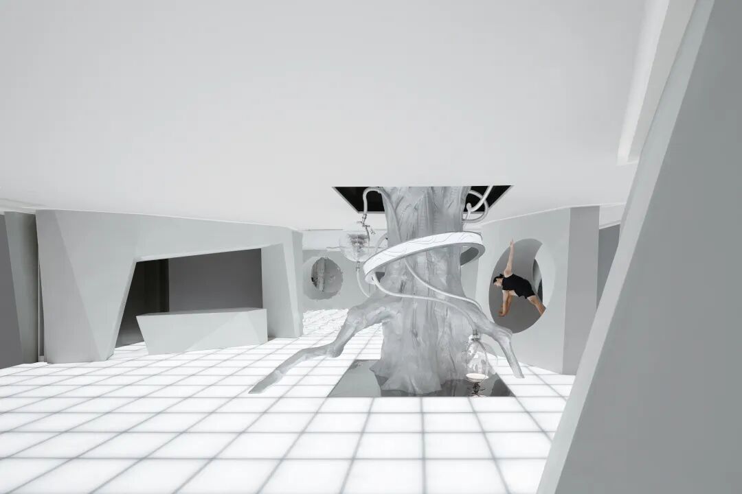 树干破白墙而出,反映了形而上的空间美学,与遗憾之树构成诗意的联结。白色通顶LED墙体印着沙丘之形,与苔藓、座椅遥相呼应。