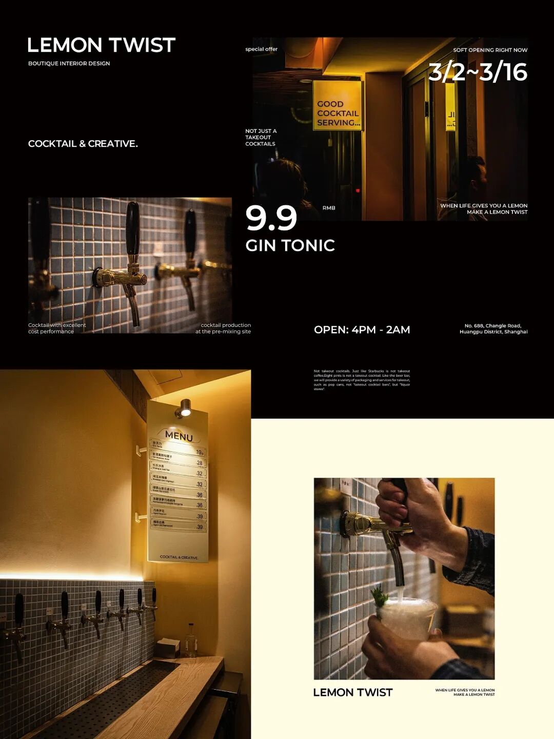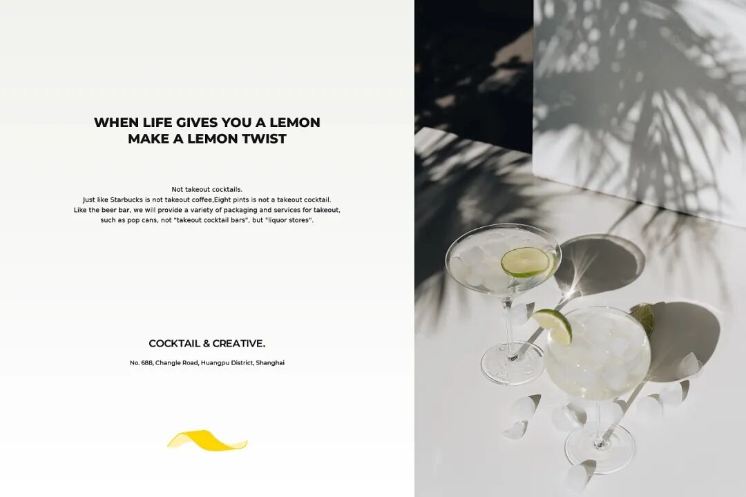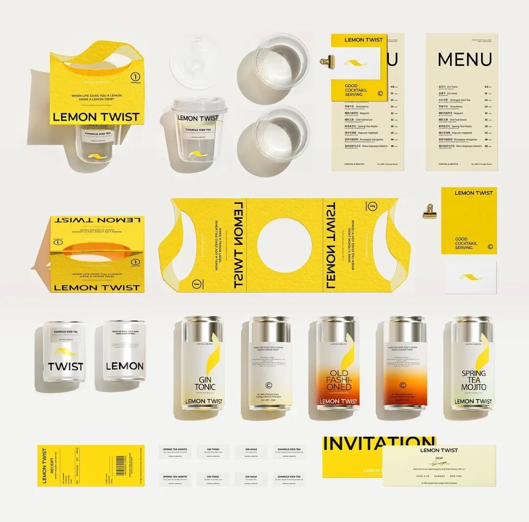 作品集2024-02-06 LEMON TWIST现打鸡尾酒吧设计,柠檬黄好搭! 图片来源:网络 LEMON TWIST是一家现打预调鸡尾酒吧,开业之后立马收到了众多酒友的追捧,品牌以其超高的性价比和全网首推金汤力9.9元的营销推广受到了一众好评,每日爆满。THEQ 为其打造了一套完整的品牌视觉形象,帮助客户在沿街其他品牌的激烈竞争下脱颖而出,配合本身非常能打的产品力,取得了非常成功的商业效果。 设计本身立足于品牌“lemon twist” 中文名意为柠檬卷,喝酒的朋友应该都知道,就是鸡尾酒中经常使用柠檬皮做的装饰。在设计中我们强化了柠檬卷这一品牌视觉图形,并不断在品牌色体系、产品物料中强化,在消费者心中逐渐形成深刻的记忆。 LEMON TWIST 现打鸡尾酒吧 via:THEQ缔蔻品牌设计 今日话题: 下一期想看什么设计? 本文来自微信公众号“顶尖包装”(ID:DJBZ100)。大作社经授权转载,该文观点仅代表作者本人,大作社平台仅提供信息存储空间服务。 TAGS: 包装品牌设计鸡尾酒 相关文章Kleoniki Andr…这是大王Day.281获奖作品《2020最佳图书…精选头像|搞怪来袭!安东尼奥·布埃诺 作品配色清新梦幻的场景插画,充…美国Jennifer Mc…【小鹏设计】设计小改/动力…【首发】地点空间丨打破空间…谢商家不坑之恩!只骗有钱人…