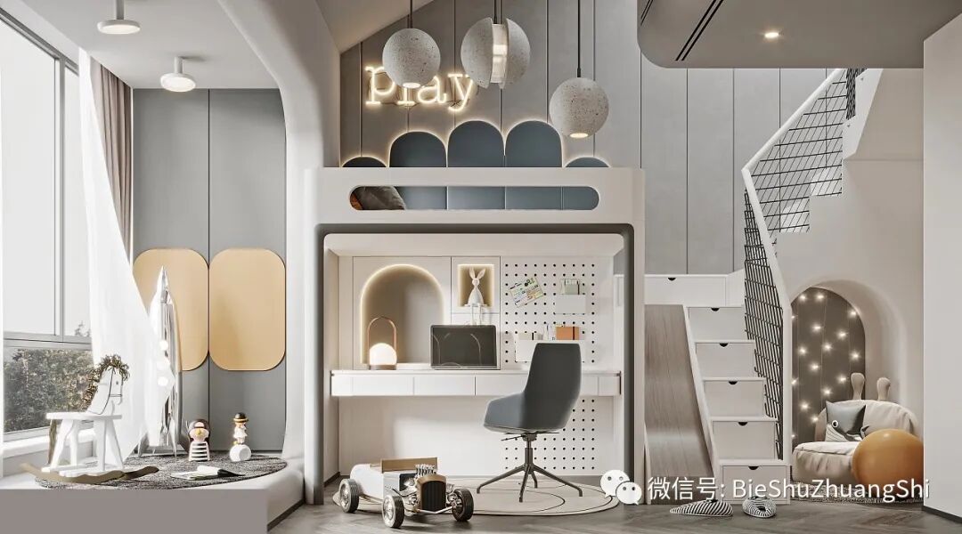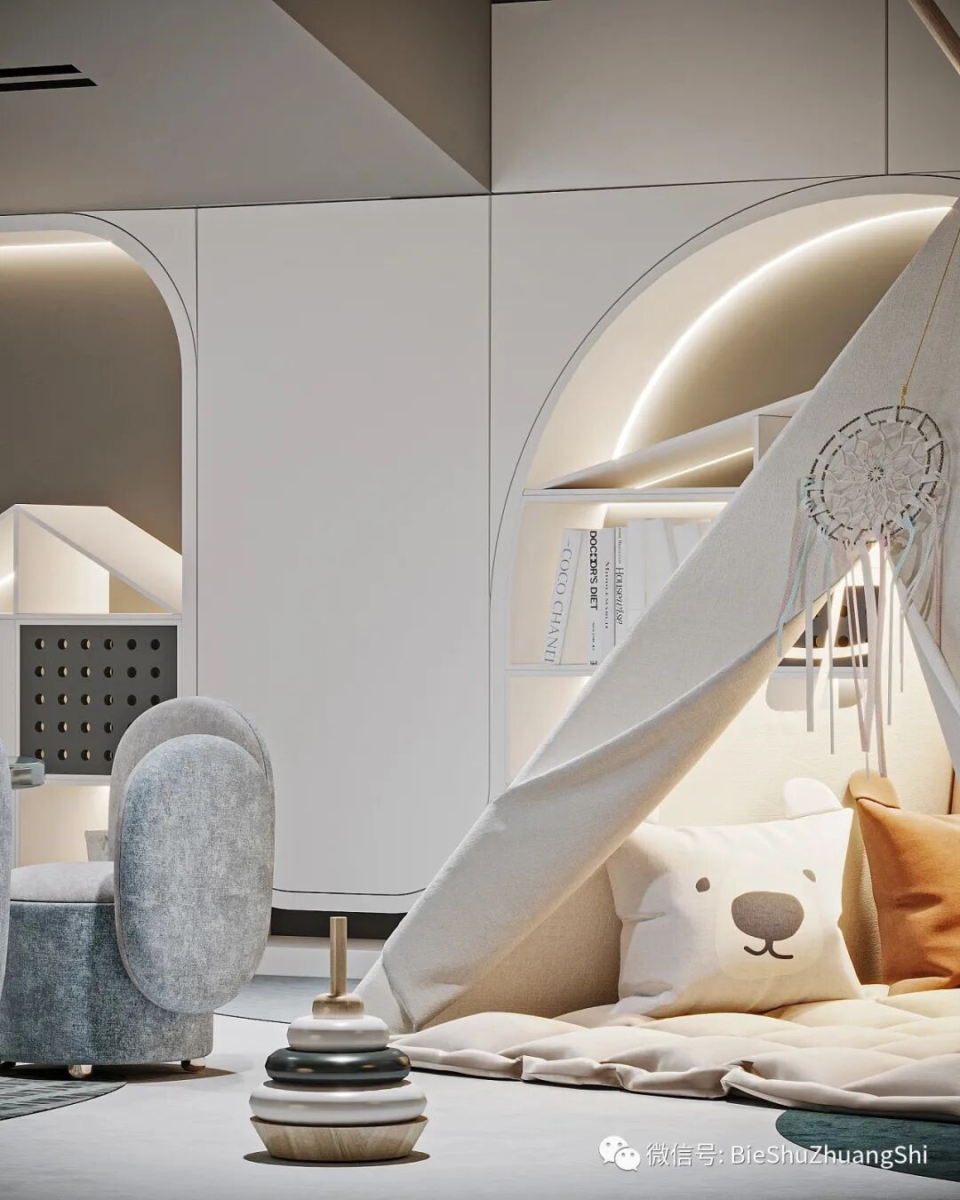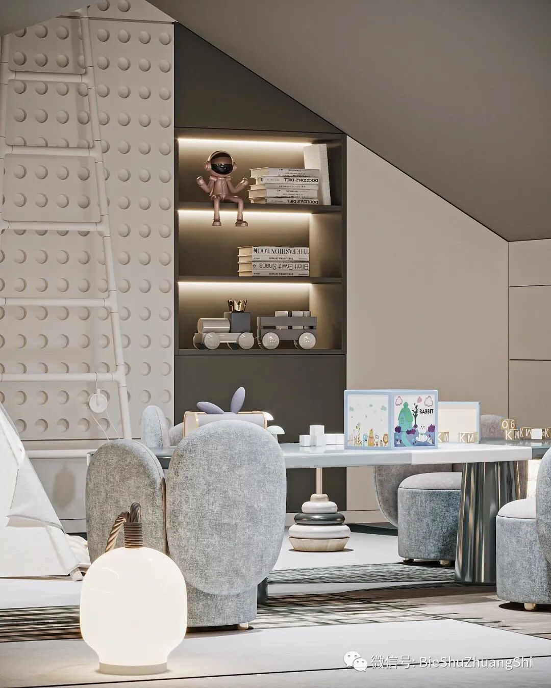 夹层两侧立面采用明艳活泼的壁布软包,既能给予的呵护,也能放飞孩童们的想象力。