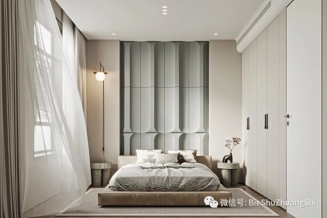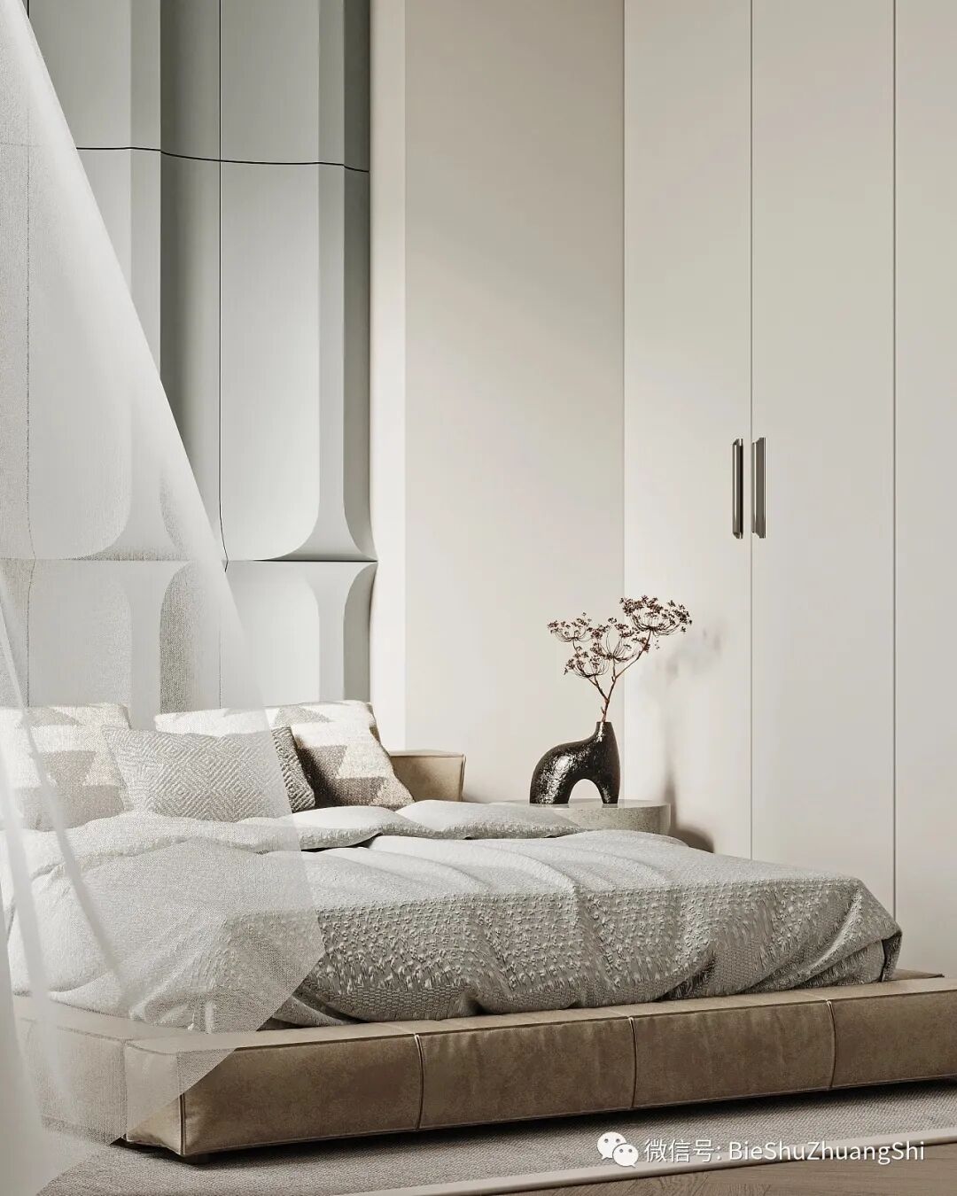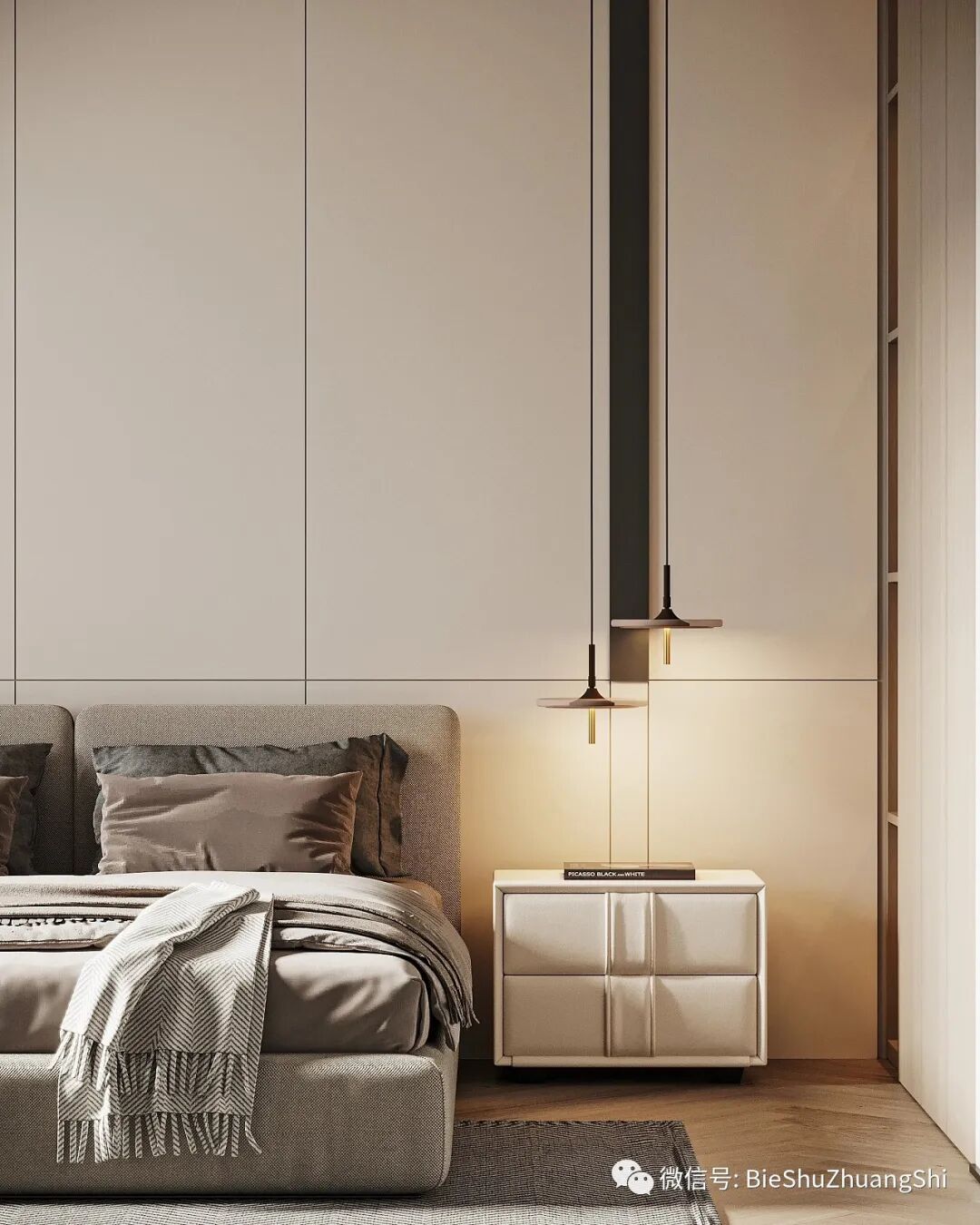 主卧室以材质承载着情绪,用光影刻录着时间,设计抛开形式,从情感层面直击内心,回归家的本真。