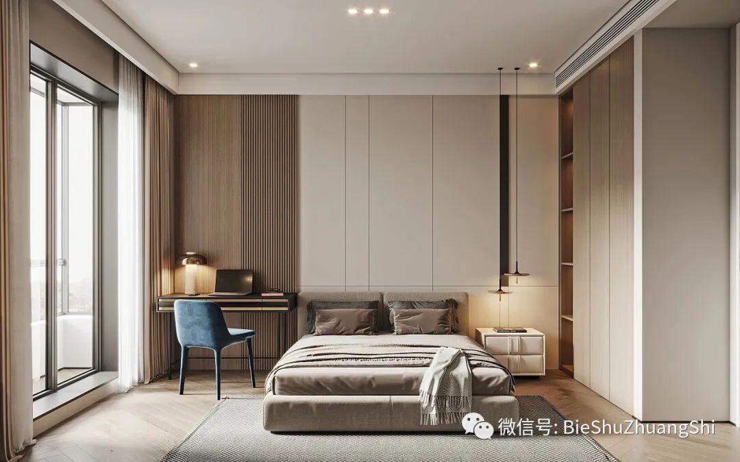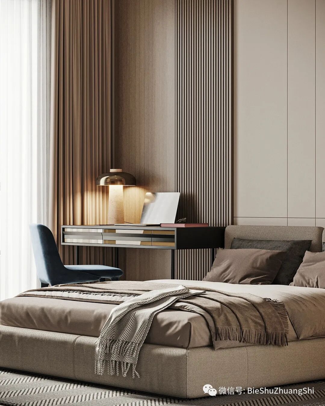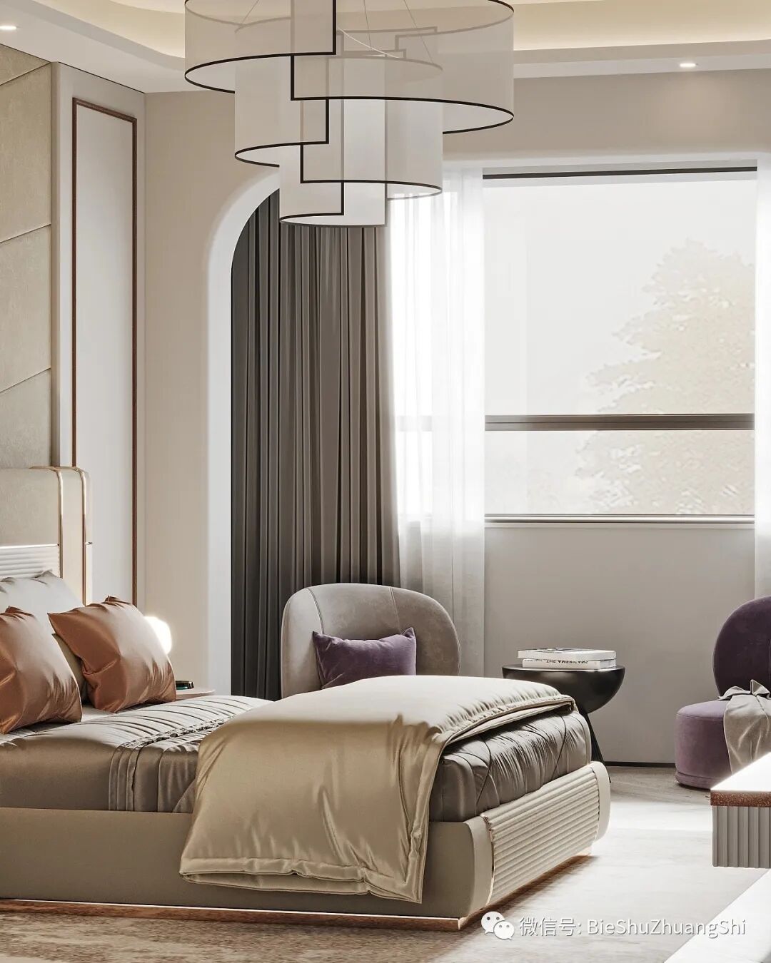 主卧室以材质承载着情绪,用光影刻录着时间,设计抛开形式,从情感层面直击内心,回归家的本真。