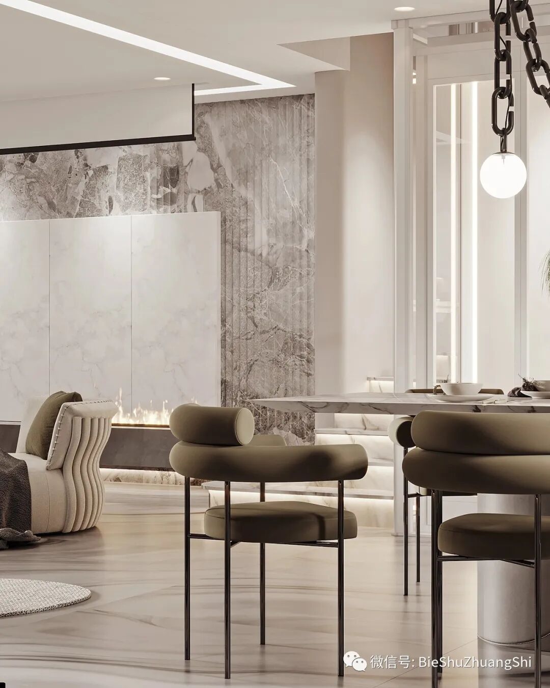 华丽的烛台,摇曳的烛火,温暖的壁炉,暖白色空间配色搭配墨绿色座椅靠背,自然简单的内核张弛有度,蕴含现代风格的美感与深度。